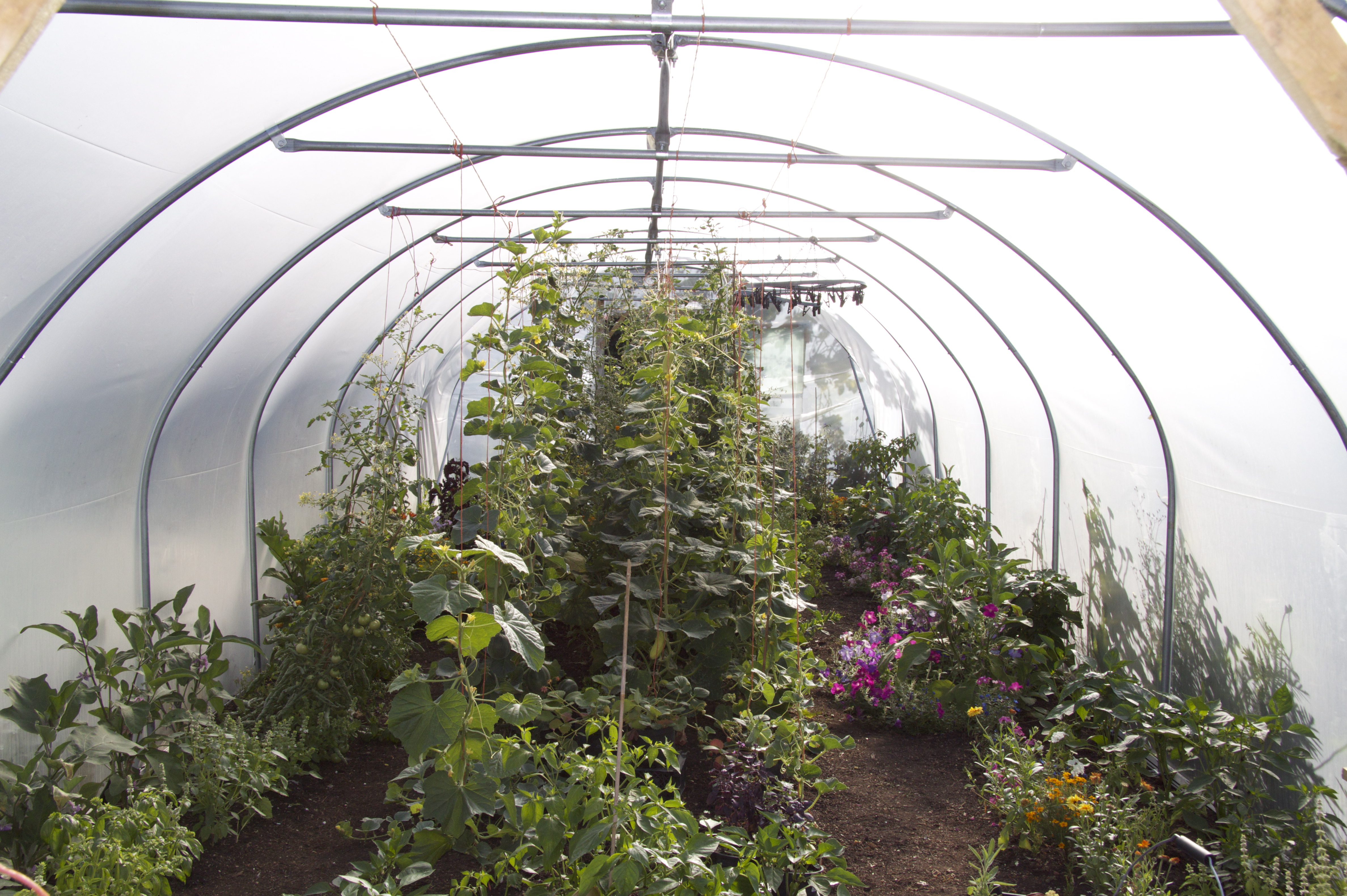 Five years ago with the help of many friends I erected a polytunnel where the small veg garden and lawn had been. A narrow concrete path, a plum tree and the hedge dividing our house from the neighbours’ dictated the size – Â a 12 ft by 40 ft straight sided tunnel with an aluminium base rail, a more expensive option but it gave me extra width as it could be situated almost right next to the path. Digging in the polythene would have meant the loss of at least a foot and probably two of width and might have killed the hedge. It was almost no dig: I wanted to get growing very quickly (it was March) and didn’t have enough available compost and well rotted manure to make beds deep enough to kill off the grass, so I skimmed this off and stacked it. The turf has since rotted down and been used to mulch another growing area.
