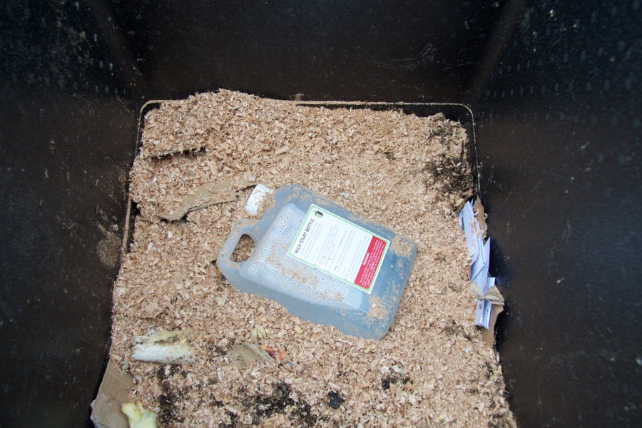 The Hotbin, light and easy to move when empty, came with easy to follow instructions and accessories including two thermometers – one for inside, one for the lid – a stirring/raking stick, a sack of bulking agent, straps to hold the hatch in place and a plastic bottle which can be used as a hot water bottle if needed, to get things started. The Hotbin works best at 40-60 C.