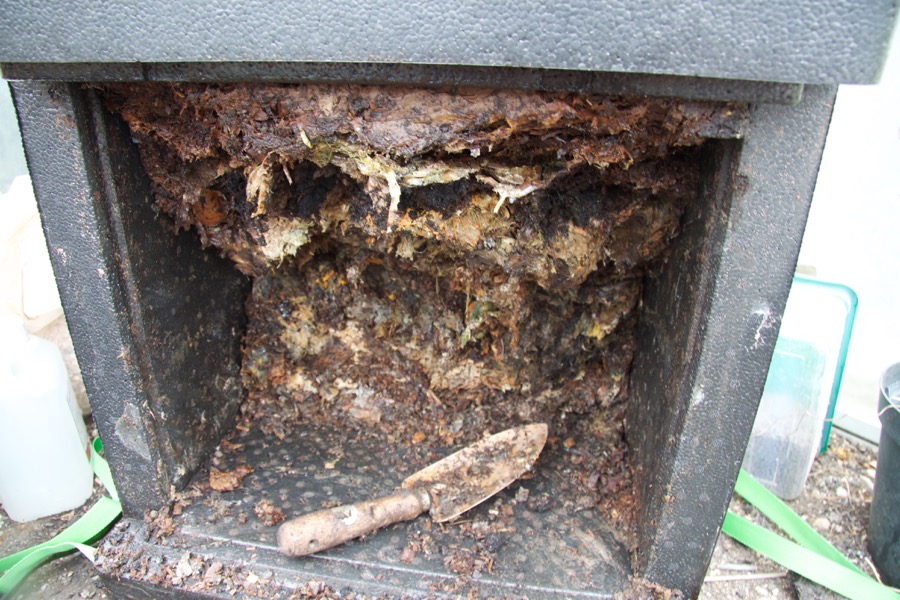 Hotbin on April 25th, we took the front panel off to have a look, contents here just over 2 months old: