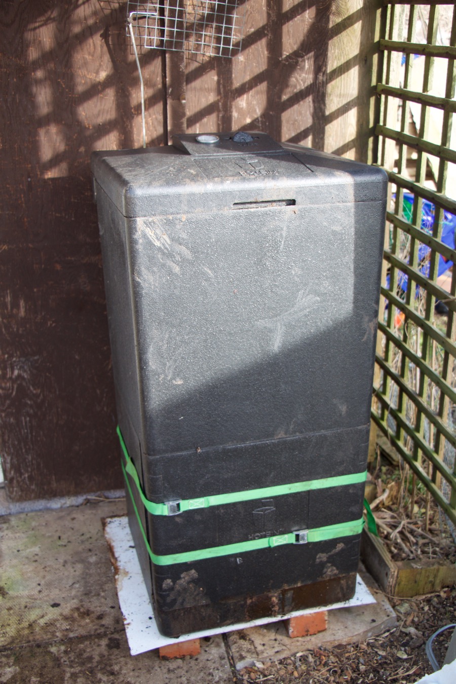 On 16th February 2016 Â I decided to move it again, this time to a position outside the shed, where it has some protection from the elements thanks to a porch. The Hotbin is very robust and I have noticed no weathering, but I thought some shelter could only be an advantage.