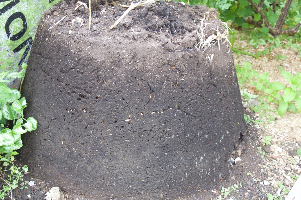 There were two compost heaps ready to mulch the tunnel: one plastic ‘dalek’ type with year old compost and a larger heap made from pallets and old wood. This heap had 3 year old compost on the bottom, two year old on top. Neither heap have ever been turned. The compost is beautifully rich, dark and crumbly. The ‘dalek’ composter simply pulls up, revealing a neat pile of compost. It also revealed some unwanted inhabitants, the ants were very alarmed!