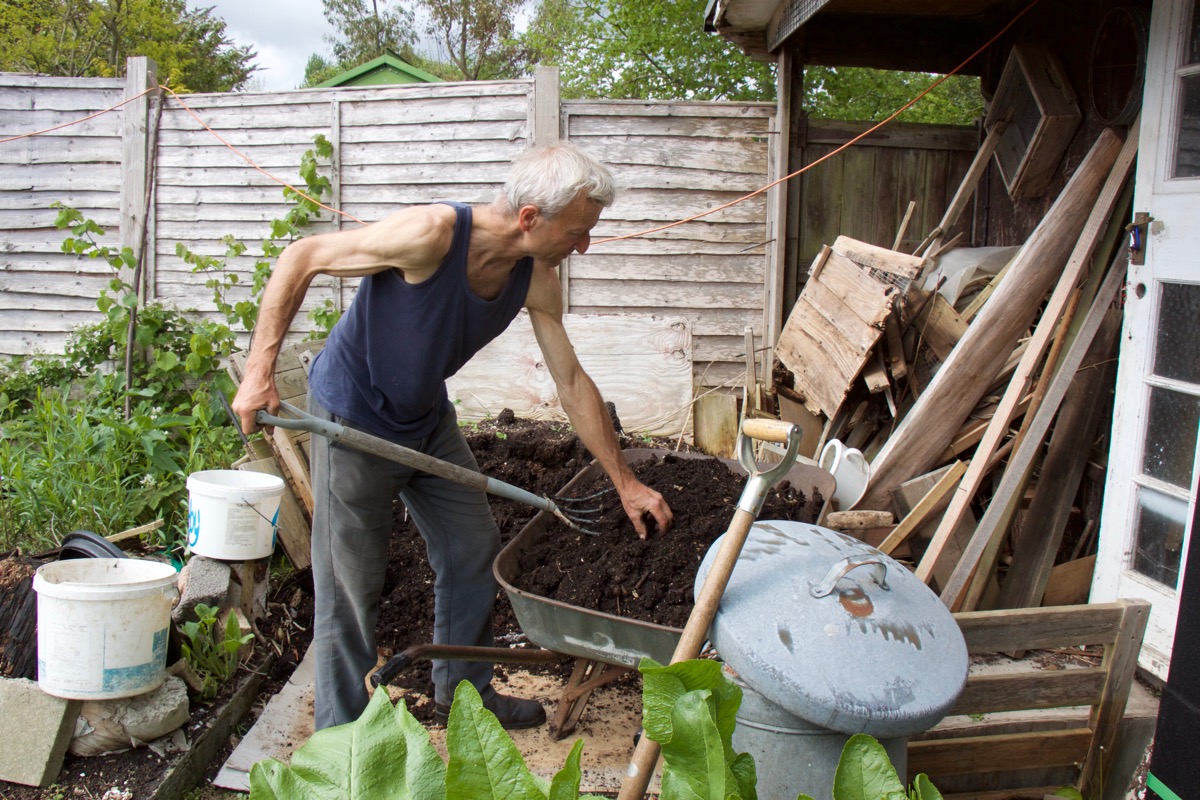 Charles came to help with the mulching. The polytunnel wasn’t mulched last year so I thought I would give the soil extra treats – powdered seaweed meal and rock dust – to add minerals and zing to the soil. It looks a bit strange at first, as if I have spread concrete dust! Here Charles had added the first wheelbarrow load of ‘dalek’ compost.