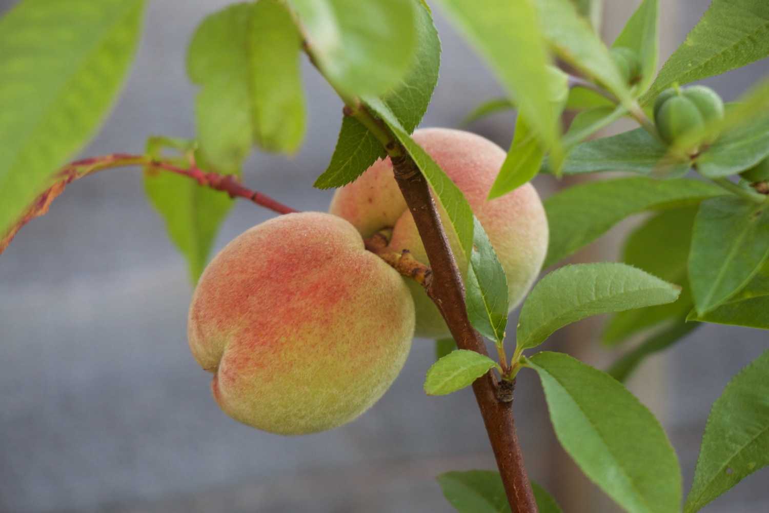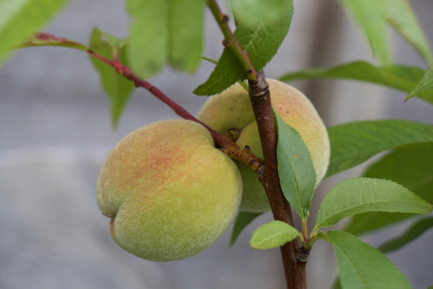 Here are two of the peaches in different stages of ripening. There are about 10 fruit on this little tree.