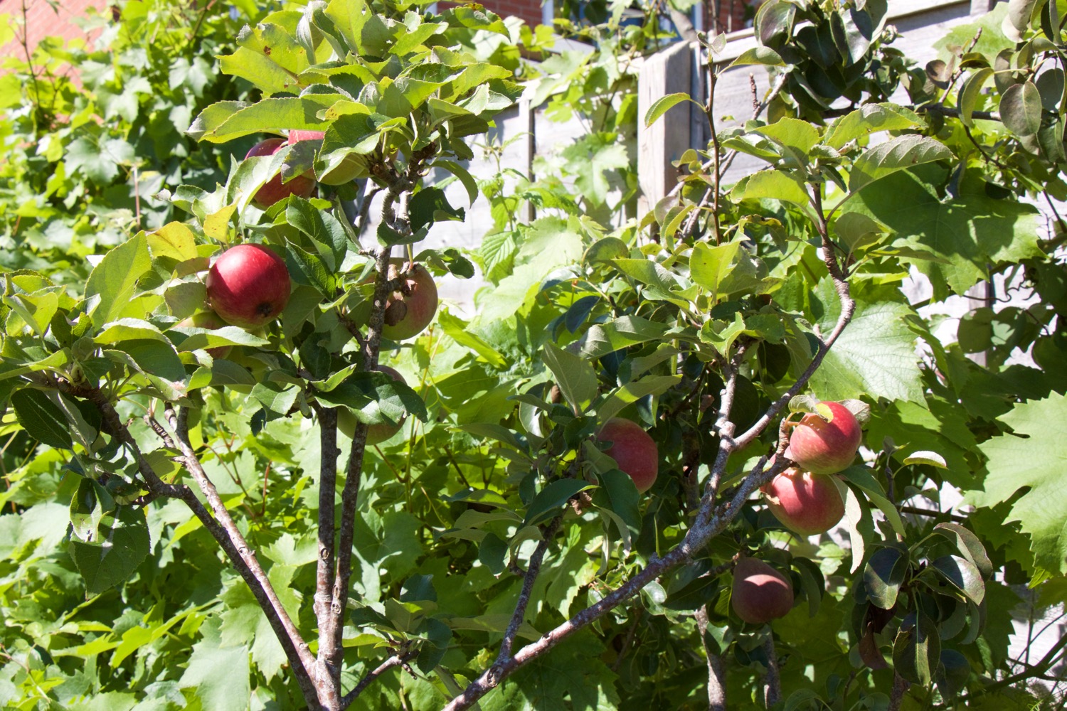 My August back garden is full of dazzling fruit, thanks to the warm and sunny weather we have been enjoying in Somerset. (Today the weather is quite different: grey skies, wild wind, rain – but the sunshine is set to return.)