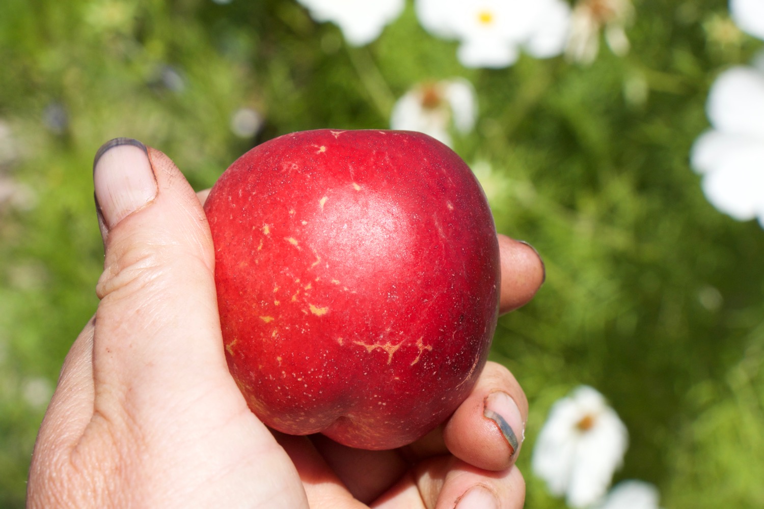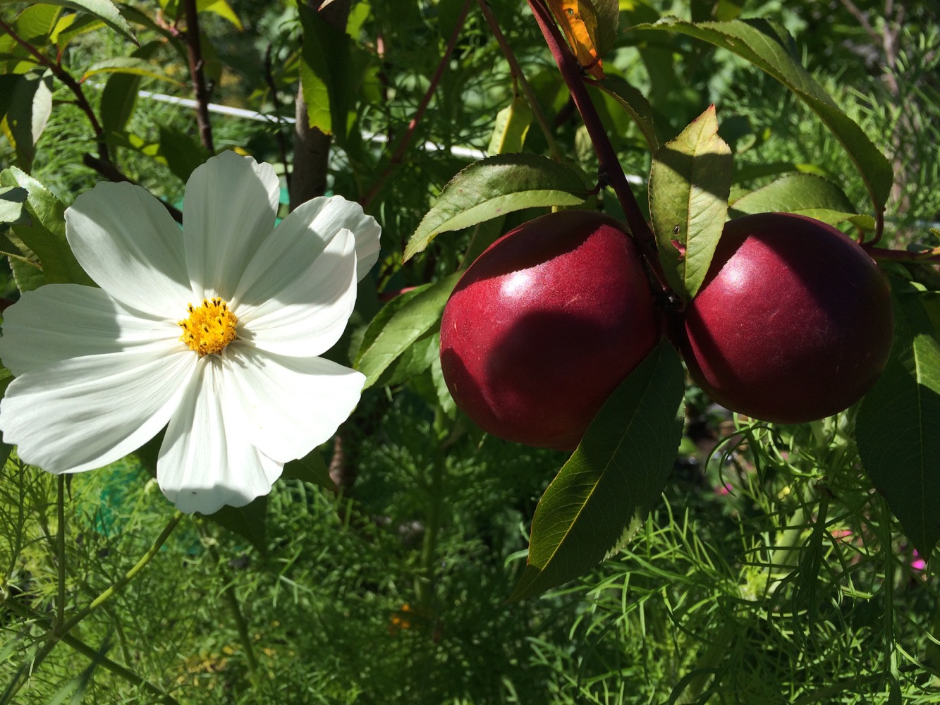 The apricot is still considering its new accommodation, producing only lush leaves this year, but the other two small trees are clearly enjoying the care and attention lavished upon them after neglect in the nursery. They produced flowers, then small fruit. One of the nectarines was mislabelled and is in fact a peach! Â As newly planted trees I should have removed the emerging fruit to allow the tree to put its energy into establishing good roots, but it is impossible to remove small furry baby peaches, especially when there are so few: they look so full of hope and potential.