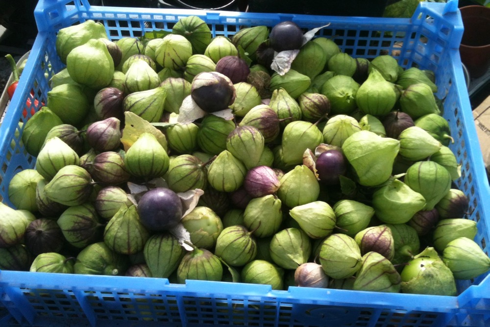 Tomatillo grows outside and in the polytunnel. I love tomatillo and have been growing them for years. They make fantastic salsa, chutneys and fried dishes and will continue cropping until the frosts kill them off.