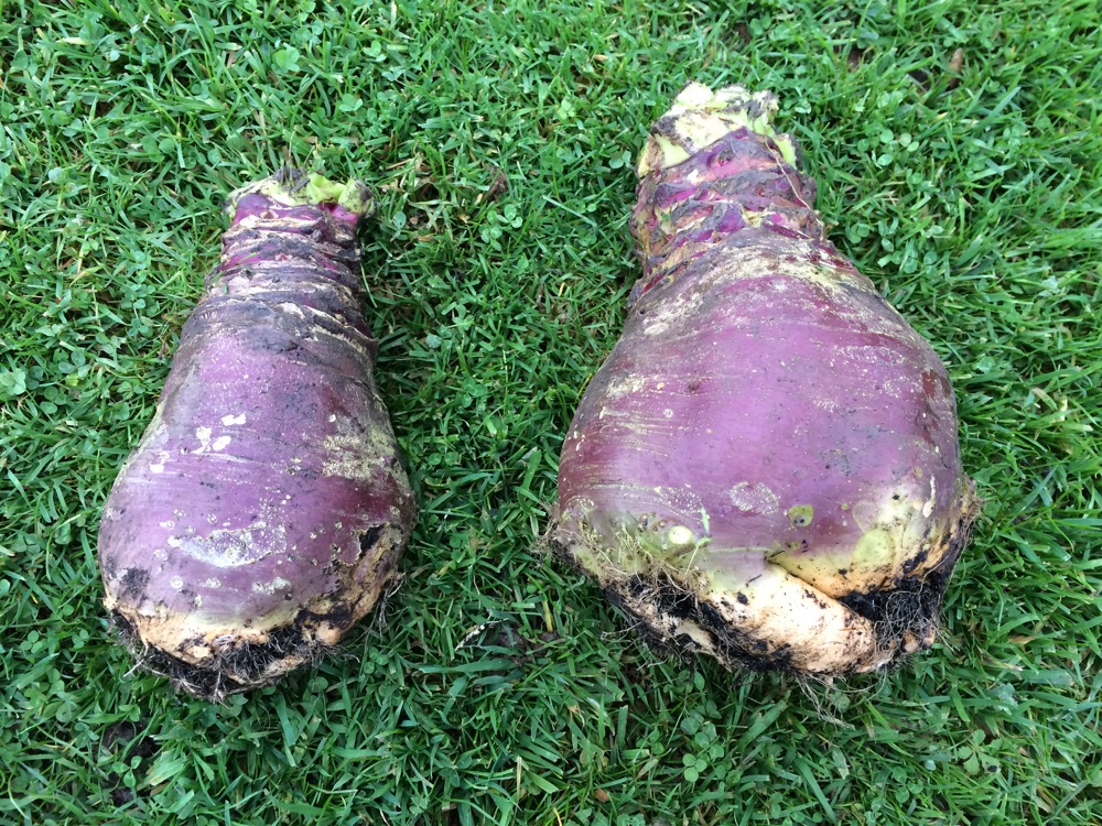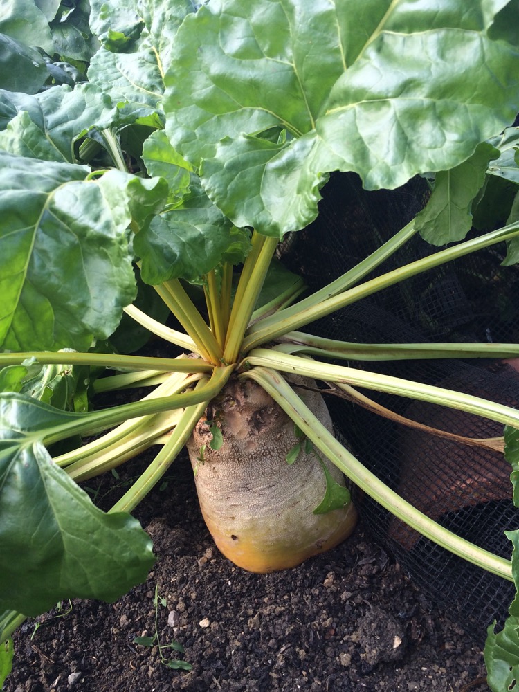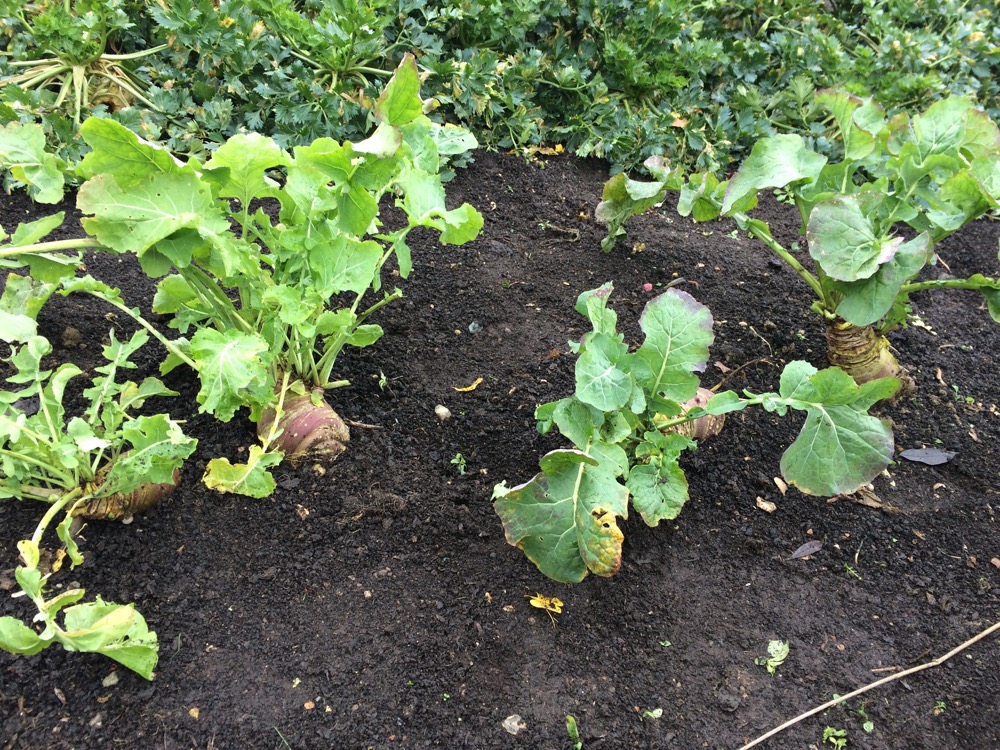 More harvests: I ran out of compost last winter one bed was partly un-mulched. The difference in the size of the swede is noticeable.