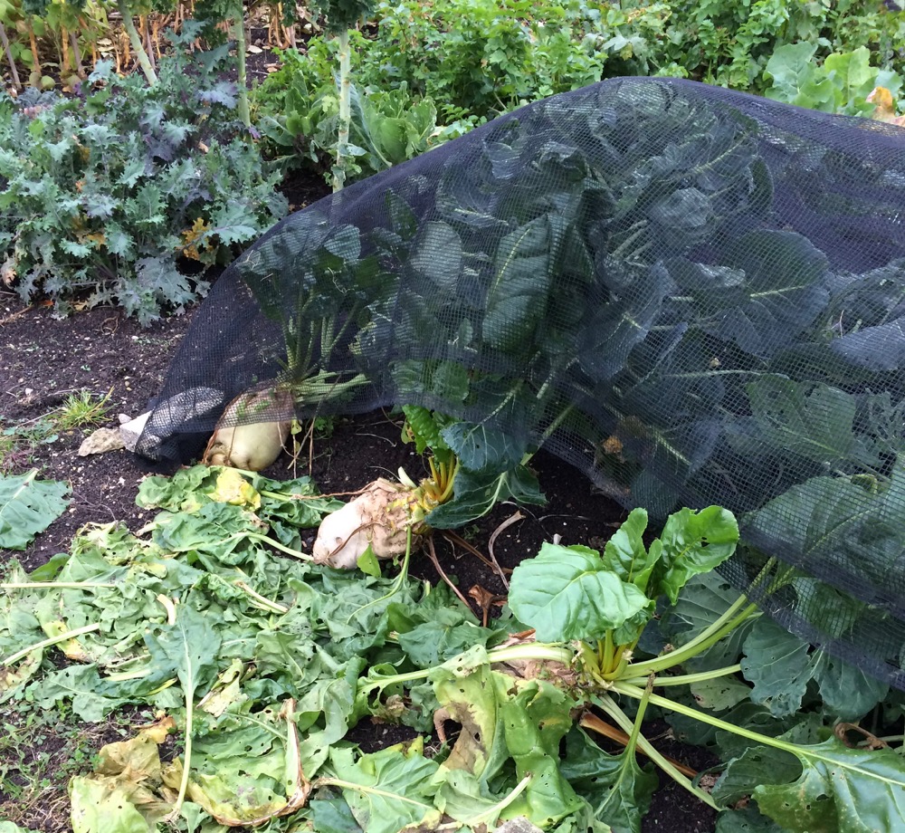 Damage to other plants – kale and mangelwurzels – suggest the possibility of deer visiting as the large leaves were snapped or bitten off, not stripped like the pigeons do. They have been netted now with enviromesh (I had run out of the butterfly netting I use for most brassicas) and should grow back.