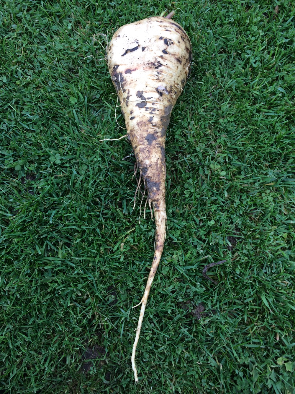 Time to harvest the six mangelwurzels! They grow delicious edible leaves (use like chard or spinach).Something removed many of the leaves and left them on the ground. The roots themselves were fortunately undamaged. Mangelwurzel is an old English name for the mangold Beta vulgaris (also known as field beet, usually grown as animal fodder). The root is eaten as one would a beetroot or swede – pickled, mashed, roasted,  raw in salads. It is said to make a strong beer. I use the root to make Mangelwurzel wine, a honey coloured potent brew which makes a person feel ‘mangelwurzeled’!