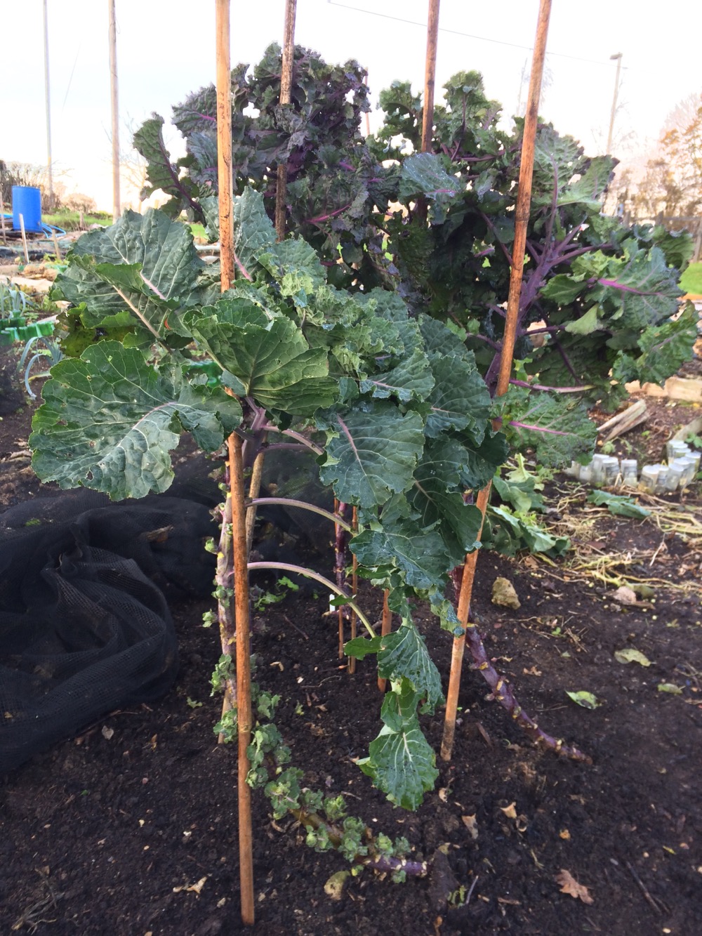 The polythene on the left is a sheet mulch to kill off unwanted invasive horseradish. My plot ends where the borage plant is – the bottle edging is a neighbours allotment. The tiny weeds have been hoed and should die off during the frosty nights.