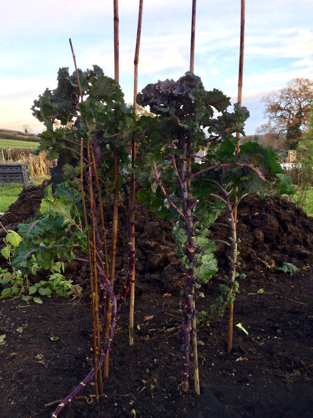 Running out of short stakes for the flowersprouts, long bean poles were used as temporary supports. This made covering them rather tricky! Looking around for something to ‘make me taller’, I used a  rake to manoevure the net over. You can see my huge pile of well rotted manure in the background.