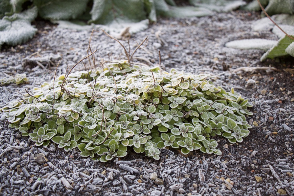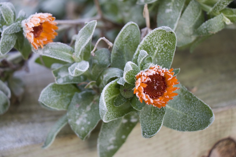 The frost captured the delicate beauty of the edible flowers and herbs.