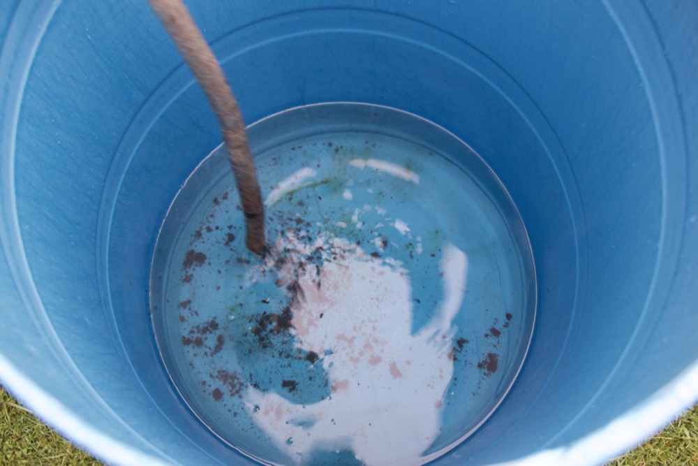 We sprinkle the preparation into the water and stir for an hour, alternating between clockwise and anticlockwise motions, creating vortices. It is great fun, I love the sound of the spinning water – we take turns to stir as it can hurt your muscles a bit. Although the fermented manure in the preparation contains millions and millions of microorganisms – bacteria, fungi etc – the liquid we make is not a nutrient feed. It is more about creating  water imbued with energy!