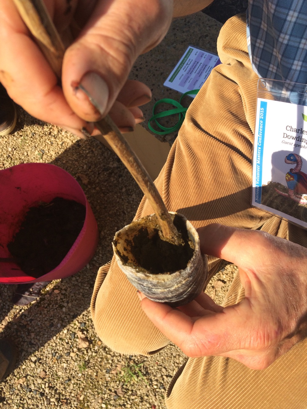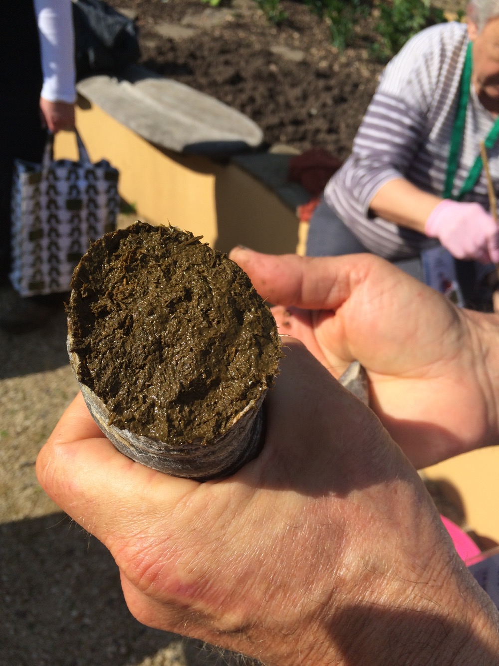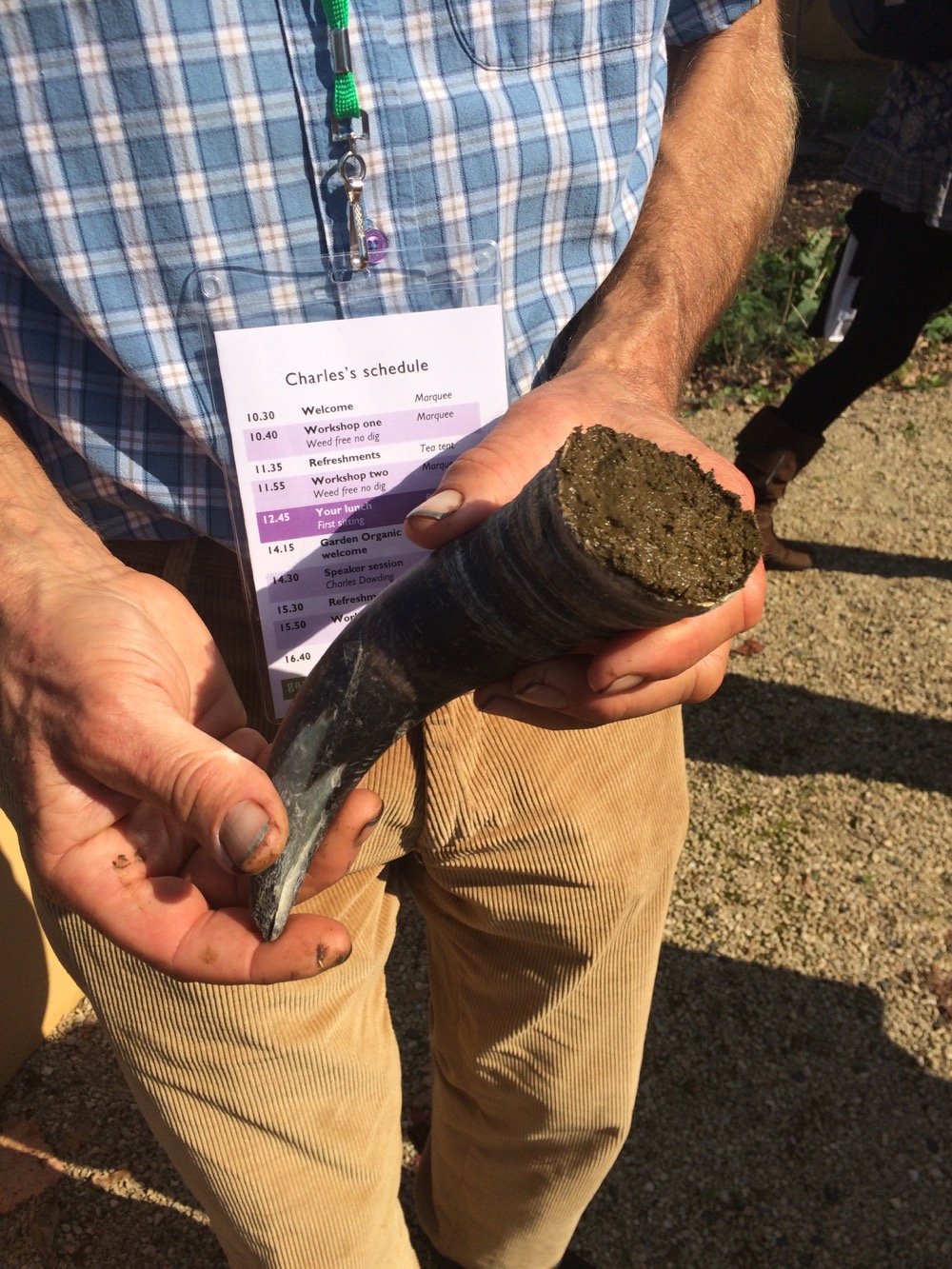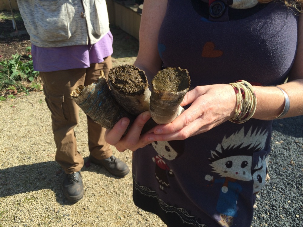 The smelly fresh manure is stuffed in the horn, pushed down with a stick then more manure is added, pushed down again and so on …