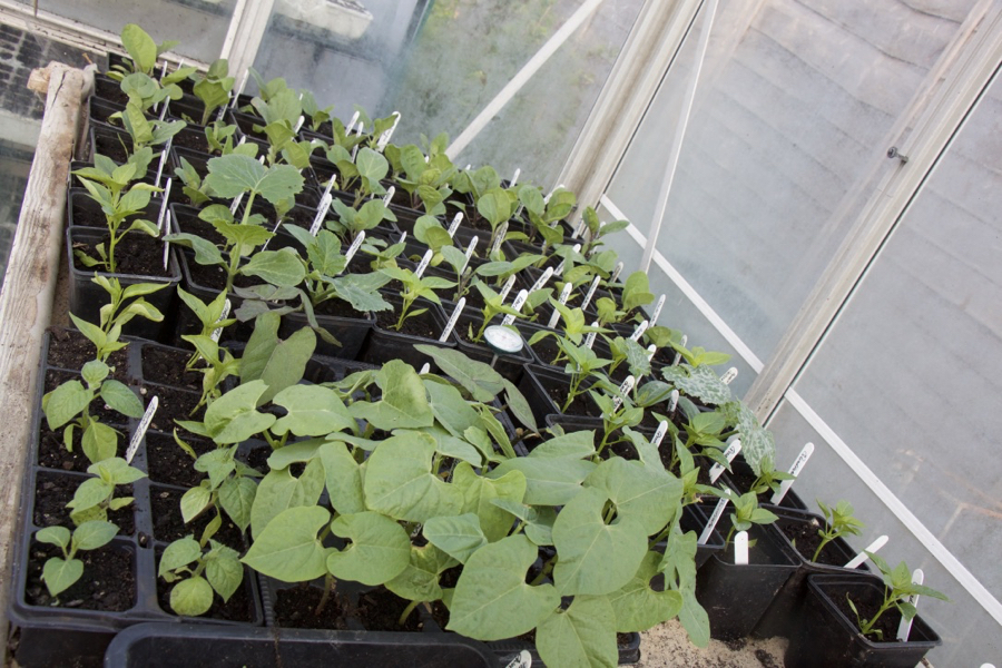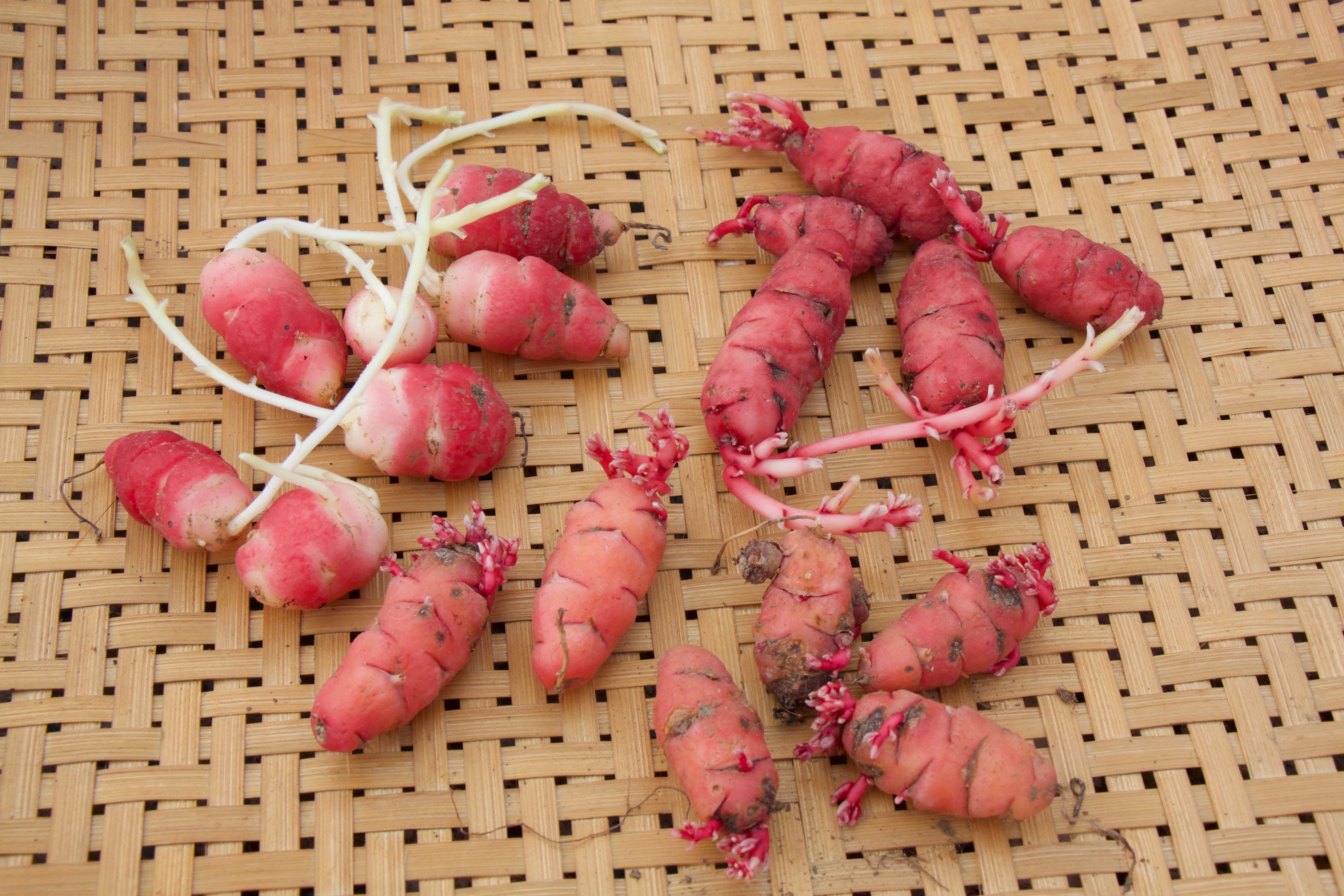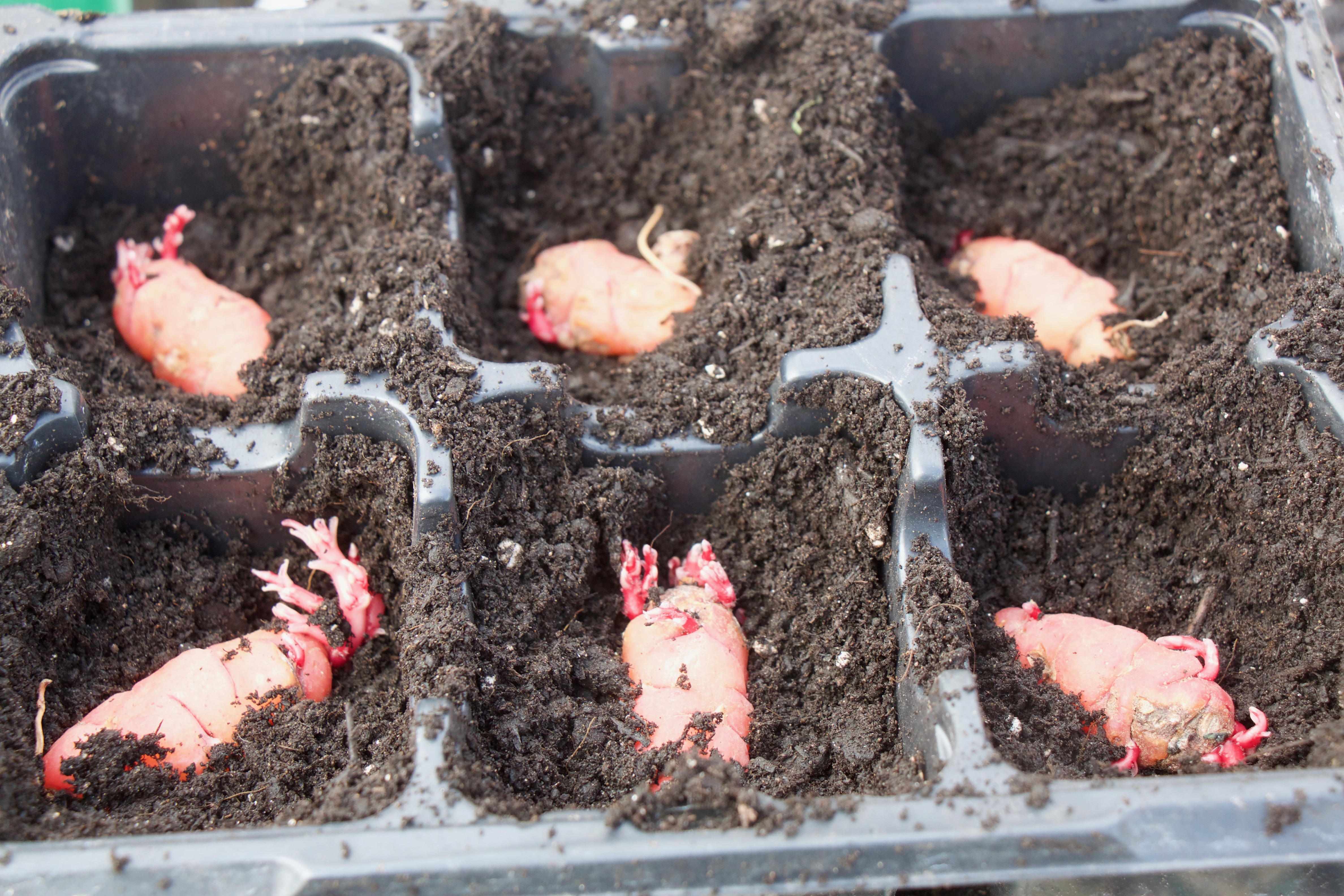 I started off oca and yacon in pots – they are now in the polytunnel. Mysteriously, the saved oca from last year has disappeared – clearly the safe place I put them in is safe even from me. Fortunately I’d already bought three new varieties to try out from Real Seeds: Strawberries and Cream, Sesam Orange and Scarlet with White Eyes.