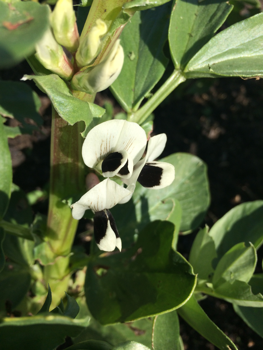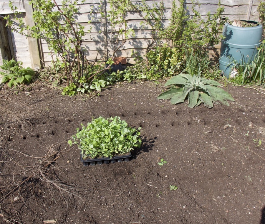 In the bed adjacent to the old apple tree, I’ve planted spring sown broad beans and Oskar early dwarf peas. This is a tricky bed, being next to my washing line. Last year I planted sweetcorn and sunflowers, a crazy idea as of course whenever I hung up the laundry, it bashed the poor plants. So I was conscious about only growing lowish plants here. The compost is beautiful, very well rotted homemade compost, but this area is infested with a lot of annual wildflower and herb seeds, so need regular hoeing. They took over somewhat last summer when an injury meant that I couldn’t keep on top of everything at home. The bees loved the flowery abundance!
