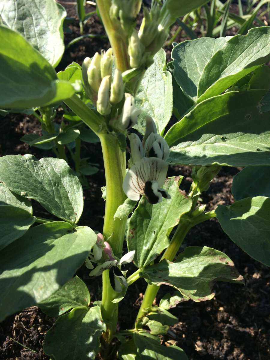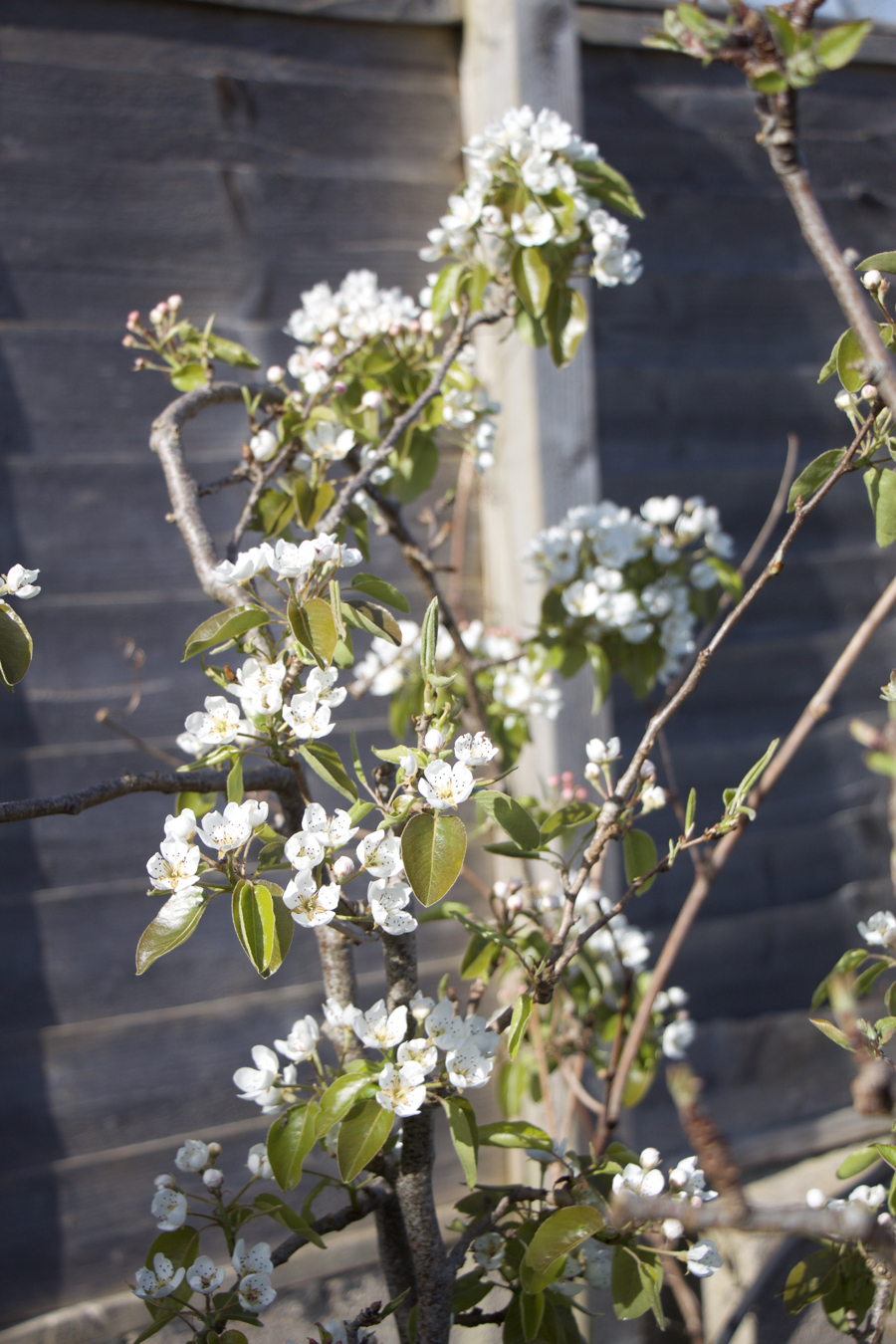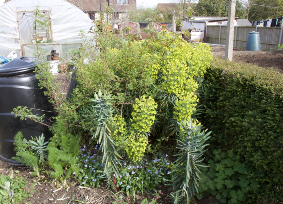 Overwintered broad beans are flowering, the garlic is looking good and I have pulled back the netting from many of the overwintered brassicas, to allow beneficial insects to feed on the flowers. The brassicas will be removed and composted when the next plants are ready to go in. I’m amazed by the borage which was really hit by the low temperatures this winter but not quite killed off – now full of flowers and much appreciated by the bees.