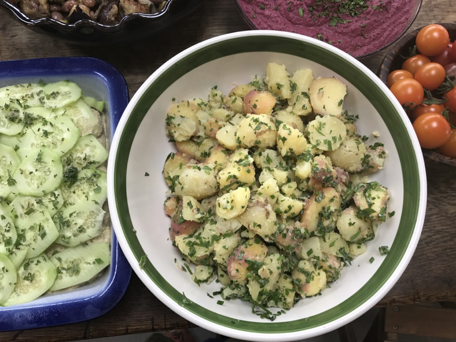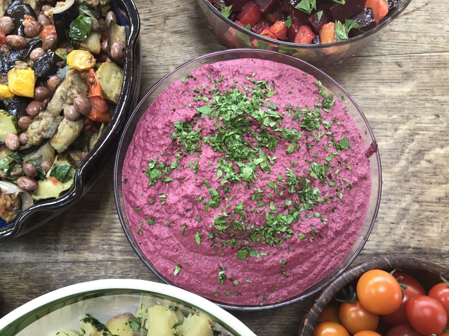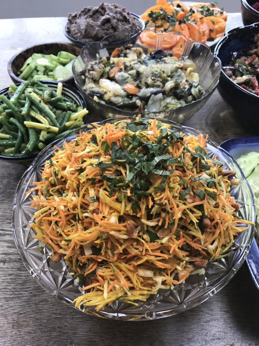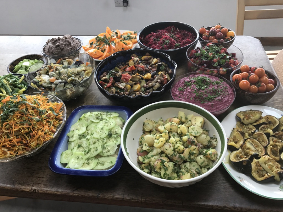 Meanwhile, the raw salads and hummus are prepared, many using a Magimix. When we first started the courses at Homeacres I used a cheese grater to prepare the shredded salads, hard work and you need to mind your knuckles! A mandolin would work here too.