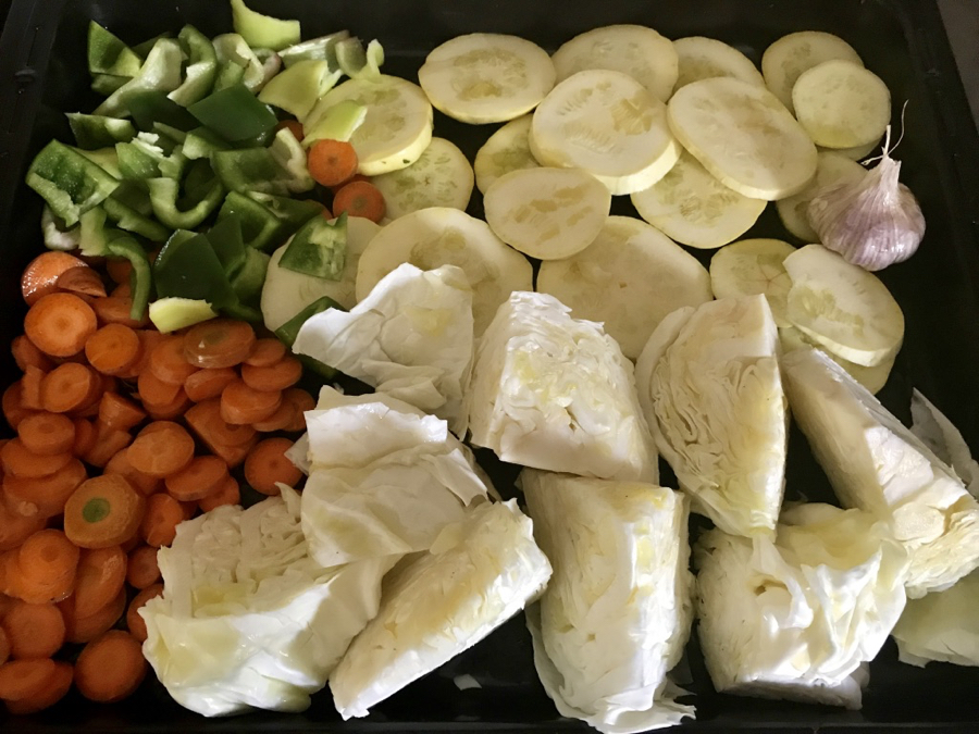 Seasonal roasted veg salad – cabbage (seriously, this is divine), onion, celery, summer patty pan squash, carrot, garlic