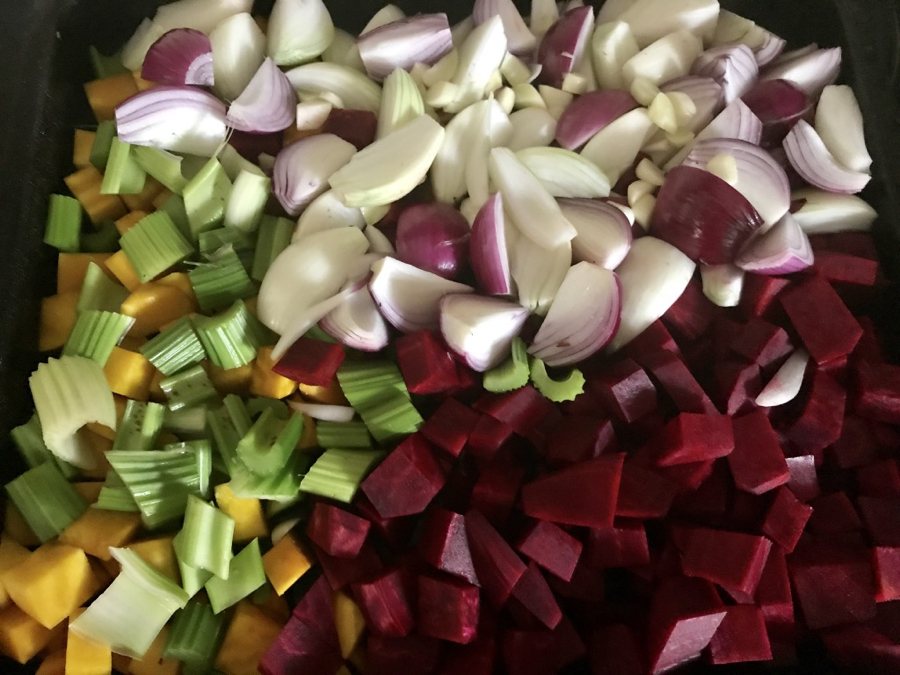 Polytunnel and seedling watering at home meant the chopping and cooking started a bit later than usual, around 7:30 am. With the oven warming, I first chop, prepare and bake anything that needs it – it’s a lot of chopping!
