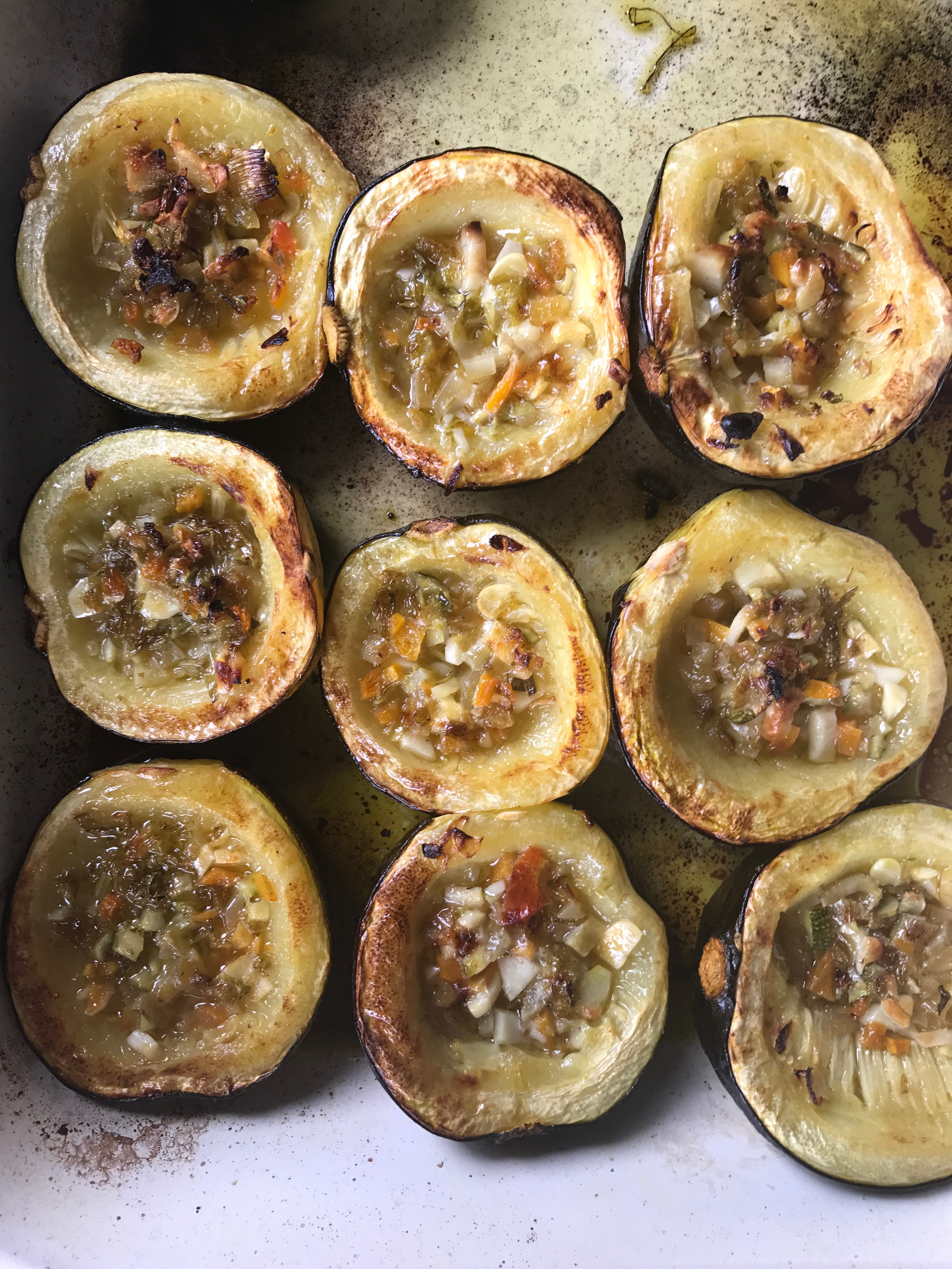Because we had more people than squash, I cut each one in half when they were cool. That’s why I didn’t completely fill the cavities, because I wanted the filling to stay in. If I was keeping them as halves, they would have been loaded with stuffing!