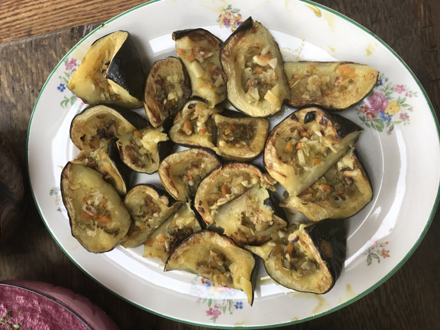 Roast aubergine, tomato, onion, courgette with borlotti salad