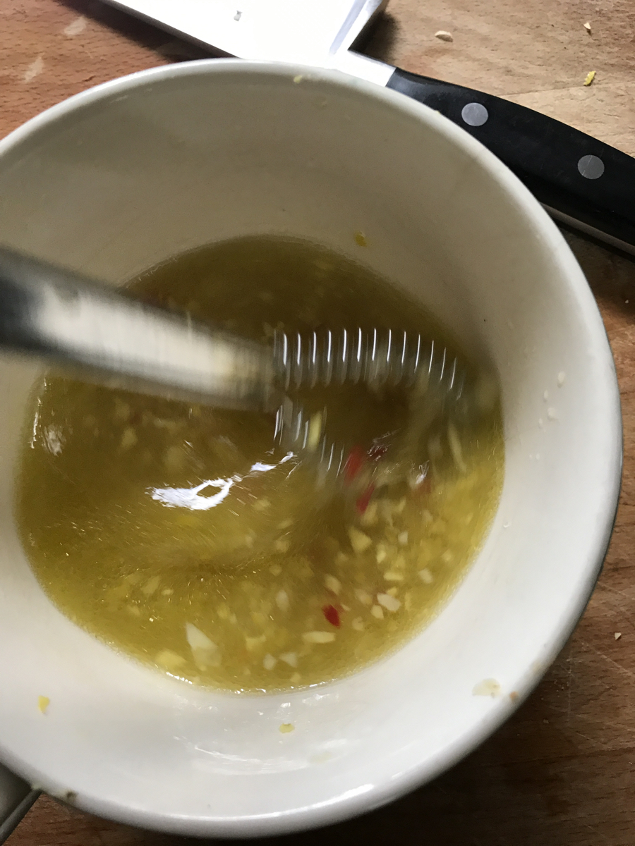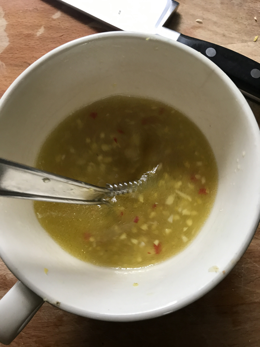 I’m enjoying trying out different variations of this easy to make, spicy summer salad – this recipe is one I made on our last course day. I’m hoping I’ve remembered all of the quantities correctly; course mornings are busy in the kitchen (I make around 12 dishes!) so I was quickly making notes and photographing it with my phone, as I was preparing it.