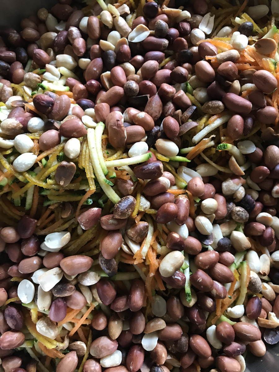 Put the grated courgette, carrot and beetroot in a bowl with half of the chopped basil, the chopped onion and peanuts.