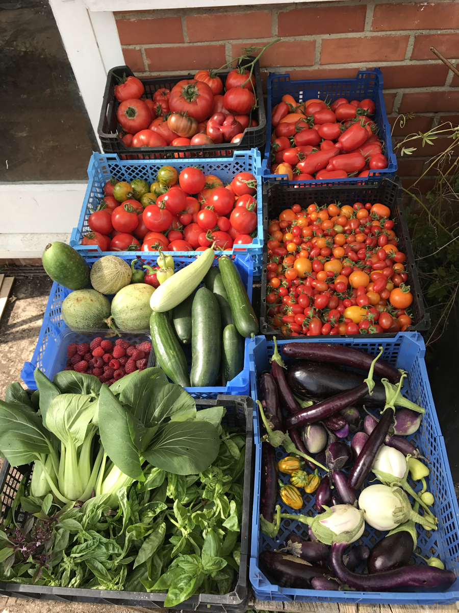 I harvested everything that was ready – only the absolute ripest of the cherry tomatoes as there are hundreds of them – including cucumbers, aubergines and sweet peppers. The raspberries are growing outside, not in my tunnel.