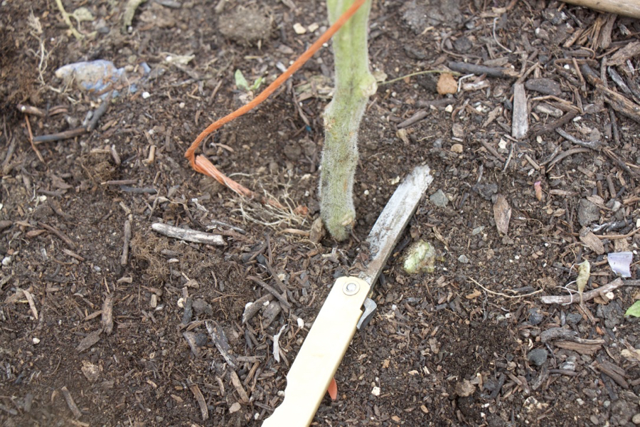 As far as possible, it is a good idea to leave the roots in the soil; they feed the microbes and other soil life. I cut as close to the ground as I can. This is a Japanese knife from Niwaki.