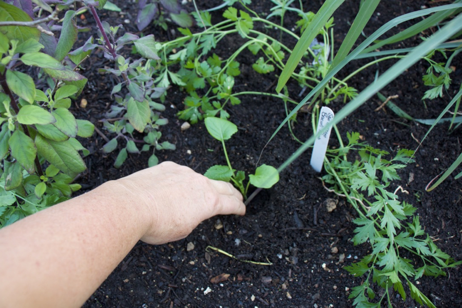 Planting is so easy. Make the hole with a dibber, pop the plant in, firm and tuck up with surrounding compost. Here, I am planting a brassica in amongst some Holy Basil – the basil will have been harvested long before the brassica grows large. Multi-cropping in this way makes maximum use of growing spaces, especially precious in a polytunnel or greenhouse.