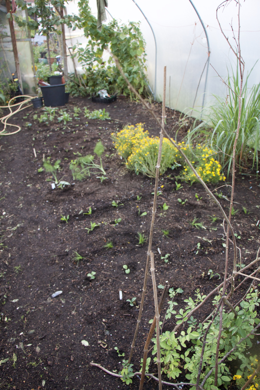 Some plants are already growing in the polytunnel so the new plantings are fitting in around them. I plant right up to the compost paths. The veggies spread their roots into the path making use of the path growing space too, underground. You can just about see the path in this photo below, the soil looks firmer.