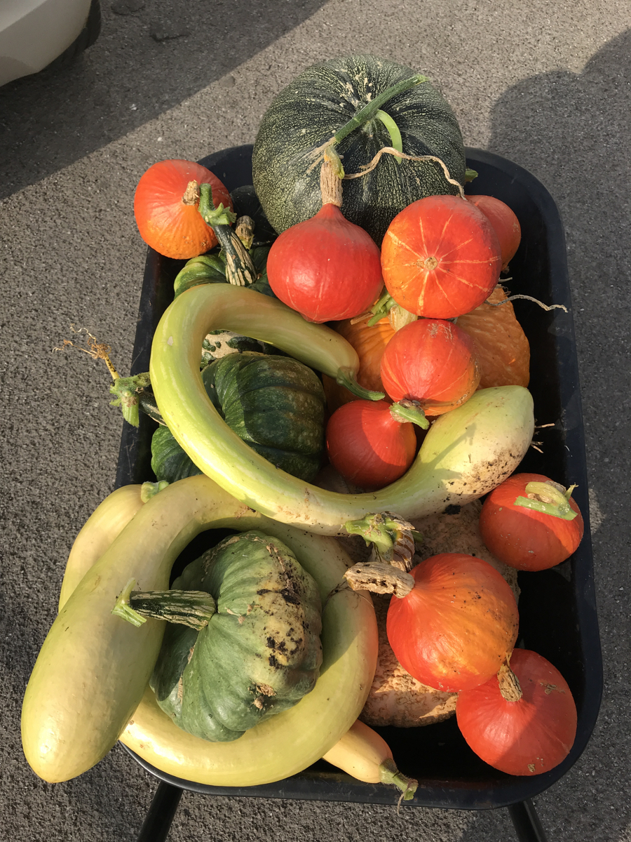 Next, to the allotment to hoe and harvest the squashes. Hoeing is so important – the mild weather we have been experiencing in Somerset is much loved by the weeds we were hoping would be slowing down now.