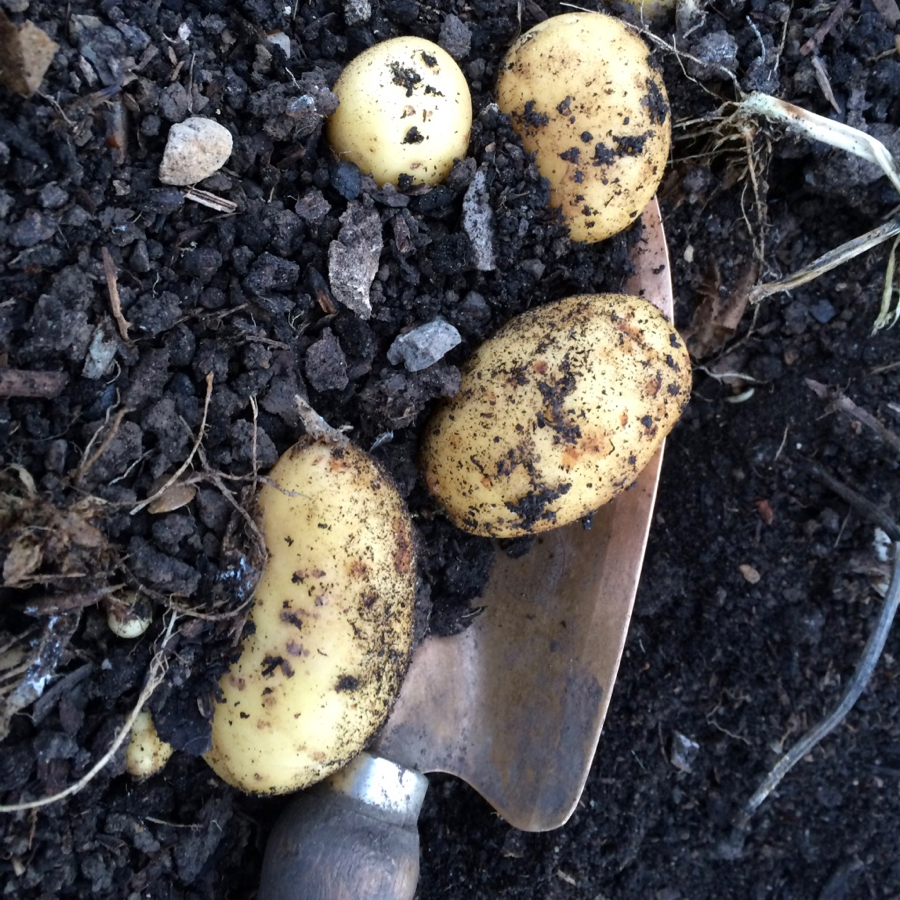 … use a trowel to make a hole in the ground, place the potato in and earth up with the surrounding compost on the bed as necessary. Harvest using a trowel (it’s rather like an archeological excavation, children love it!)