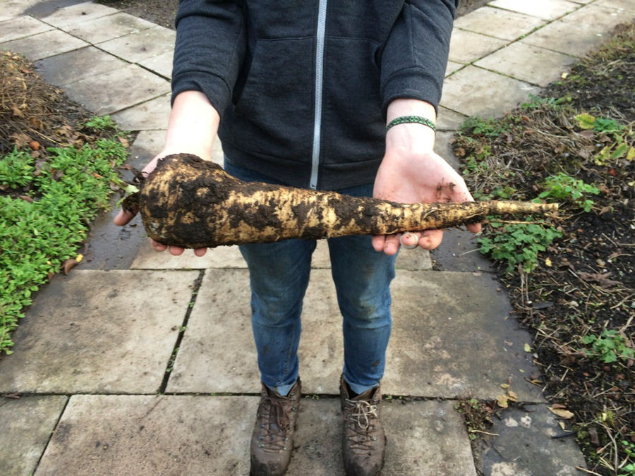Parsnips, carrots and other root vegetables grow beautifully in no dig beds, including heavy clay soils, with no need for soil cultivation – their roots descend and swell. Sow into the surface layer as usual, even well rotted animal manure. This does not cause forking because it is not dug in (forking can occur when manure is dug into the soil, not an issue with no dig!) To harvest carrots, just pull out, or wiggle a trowel next to them to loosen before pulling.