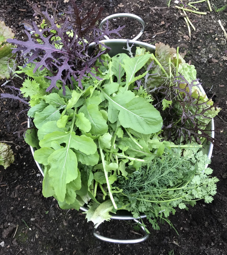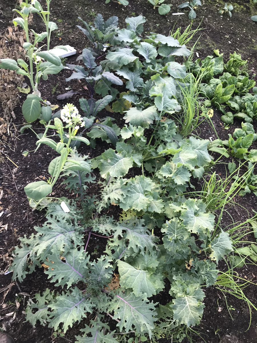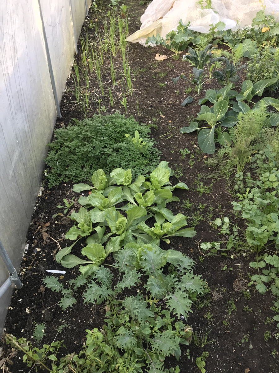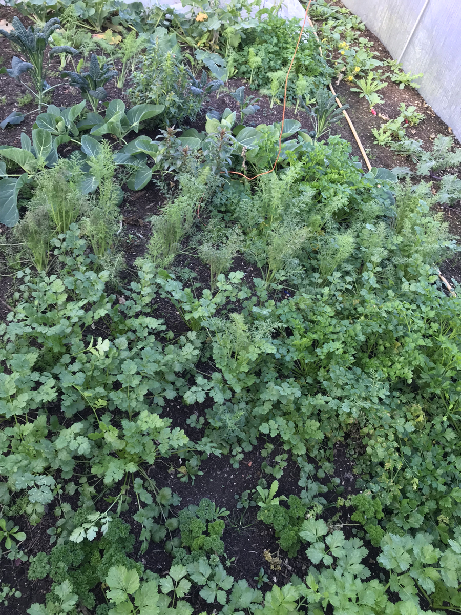 Fortunately the polytunnel survived the storms almost unscathed – Â the door needs some repairs. Seeing the lush green leaves makes my heart sing! A few of the orientals had bolted, but almost everything else is growing beautifully. The dead plants next to the fennel in the middle of the photos are gem marigolds for seed.