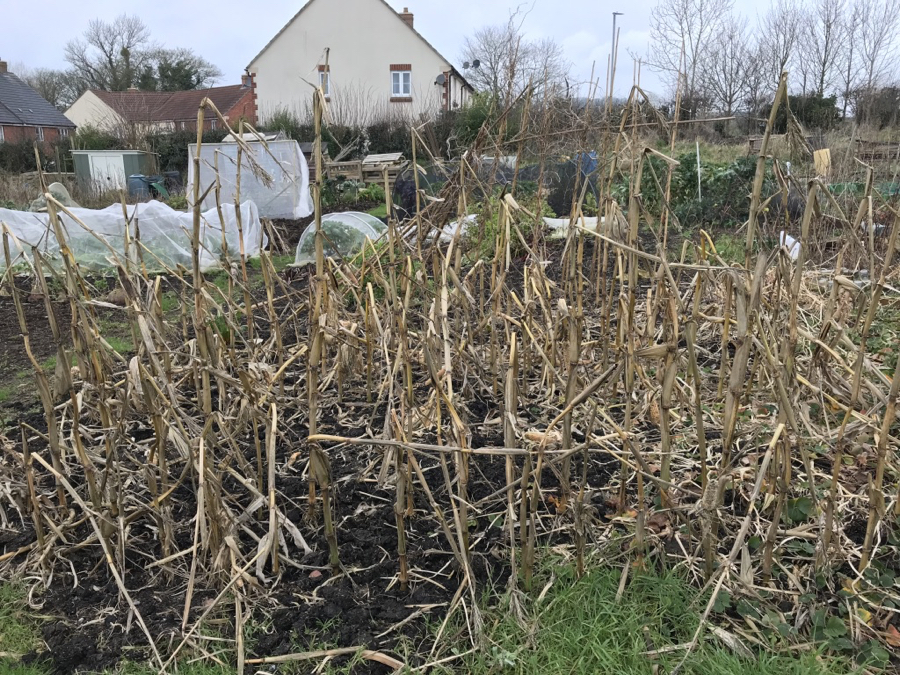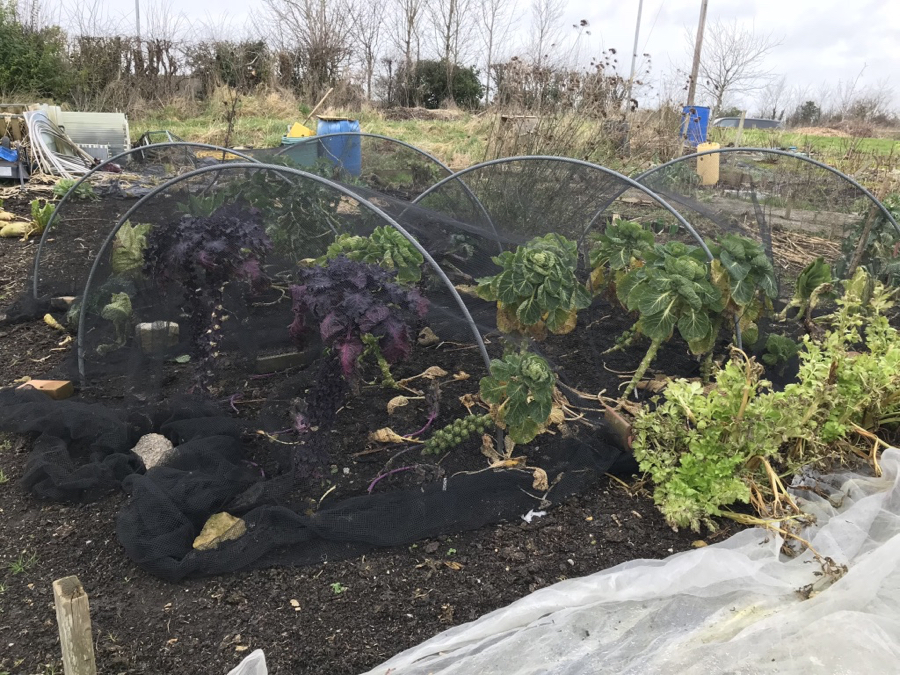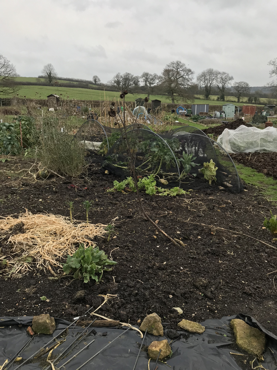 Outside, I’m happy to see garlic and broadbeans sprouting after rather a late planting. I still haven’t had time to clear last year’s sweetcorn – the wild weather has done a great job breaking it down for me! Jobs this week (weather and lurgie permitting, I have some kind of wintry chest bug) include weeding the invasive grass creeping in at the front of the plot, tidying dead leaves from the brassicas and harvesting more beetroot. The experiment has worked so far – I usually harvest and store in the autumn, but tried fleecing instead (a double layer of fleece, topped with enviromesh). More news on this experiment when I harvest the beets.