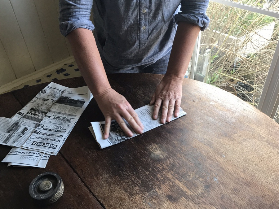 Fold the sheets in half, tear along the fold, place these strips to one side and repeat until you have enough for your pots. Make sure they are deep enough to form the base. You’ll need about 6 cm overhang to make the bottom of the pots.