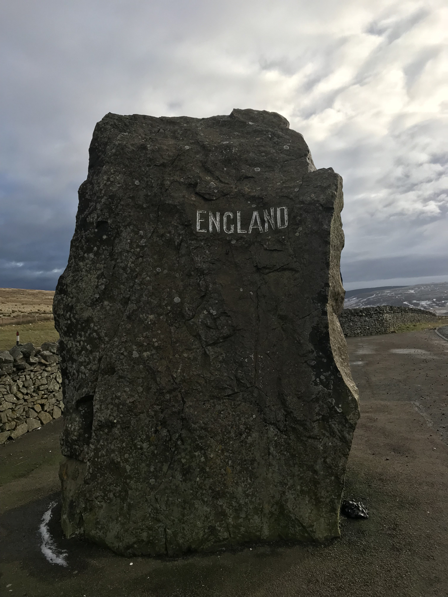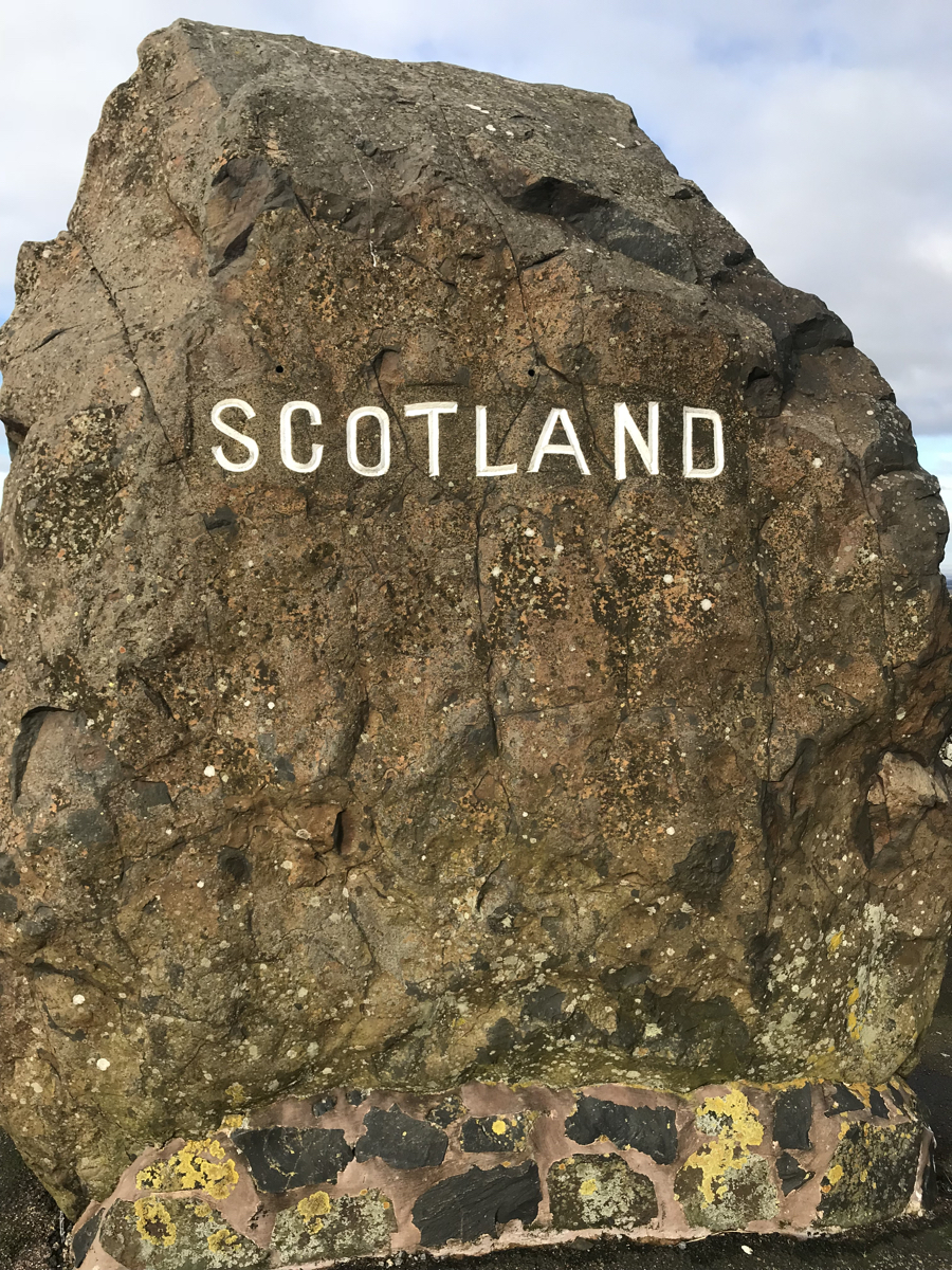 I drove us towards Scotland through some of the most spectacular countryside I have seen (no photos as I was driving!) After several hours we reached the Scottish border, with England on one side…
