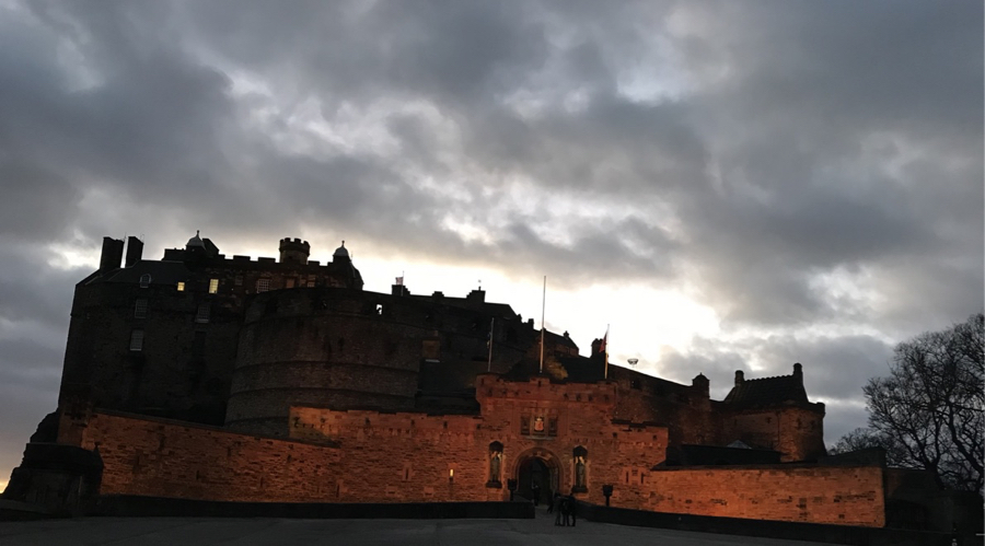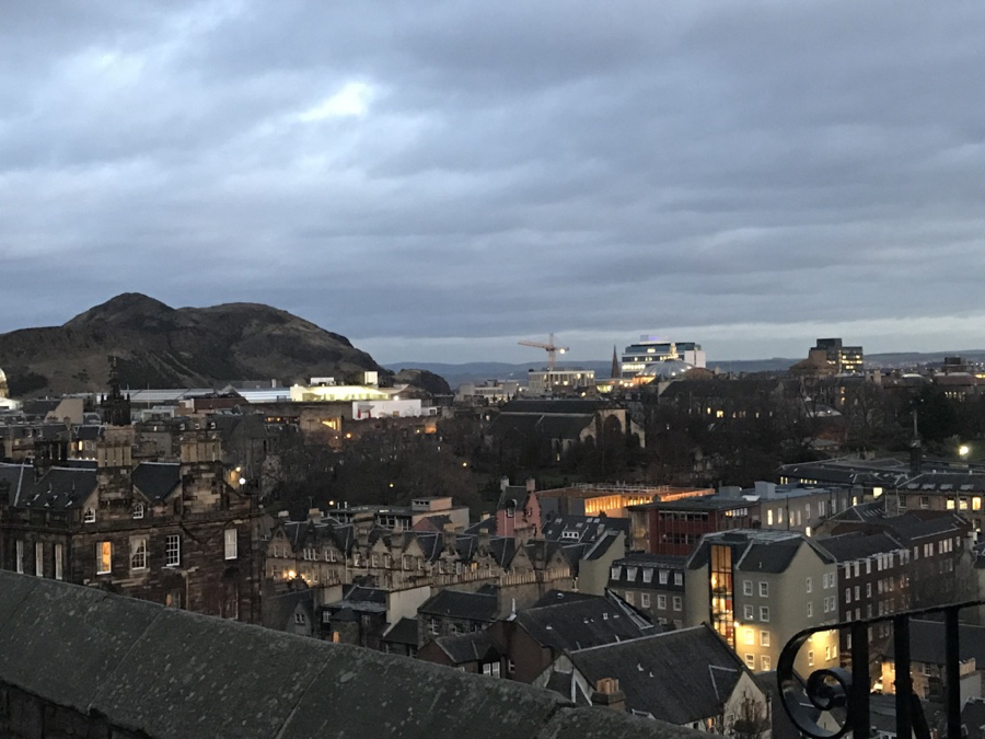 After stopping briefly to take these photos, we set off again for Edinburgh – again, through spectacular countryside. We enjoyed a wee dram kindly left for us by the hotel. I went out to explore for a while. The views from Edinburgh Castle as the night fell were spectacular.