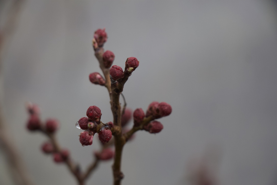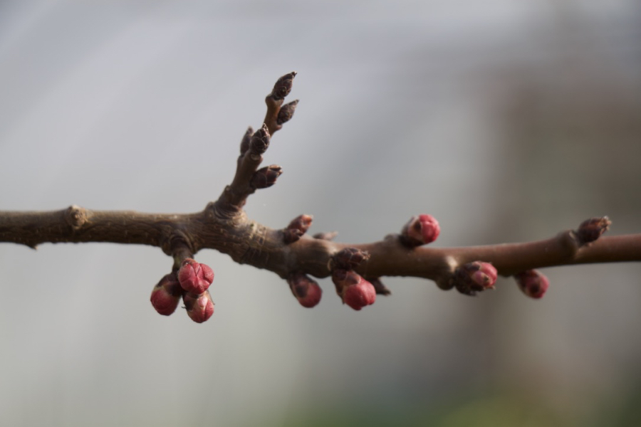 In the polytunnel the dwarf apricot Aprigold and the as yet unidentified potted tree are both in very similar looking bud. Outside, a Red Filbert Cob Nut has stunning pink catkins. Signs of spring … but winter is still very much with us. Today we have had some snow flurries here in Somerset and icy cold winds. There are weather warnings for more extreme conditions later in the week. Much as I love snow, I hope it holds off for another day so that I can get to London tomorrow for the Garden Press Event.