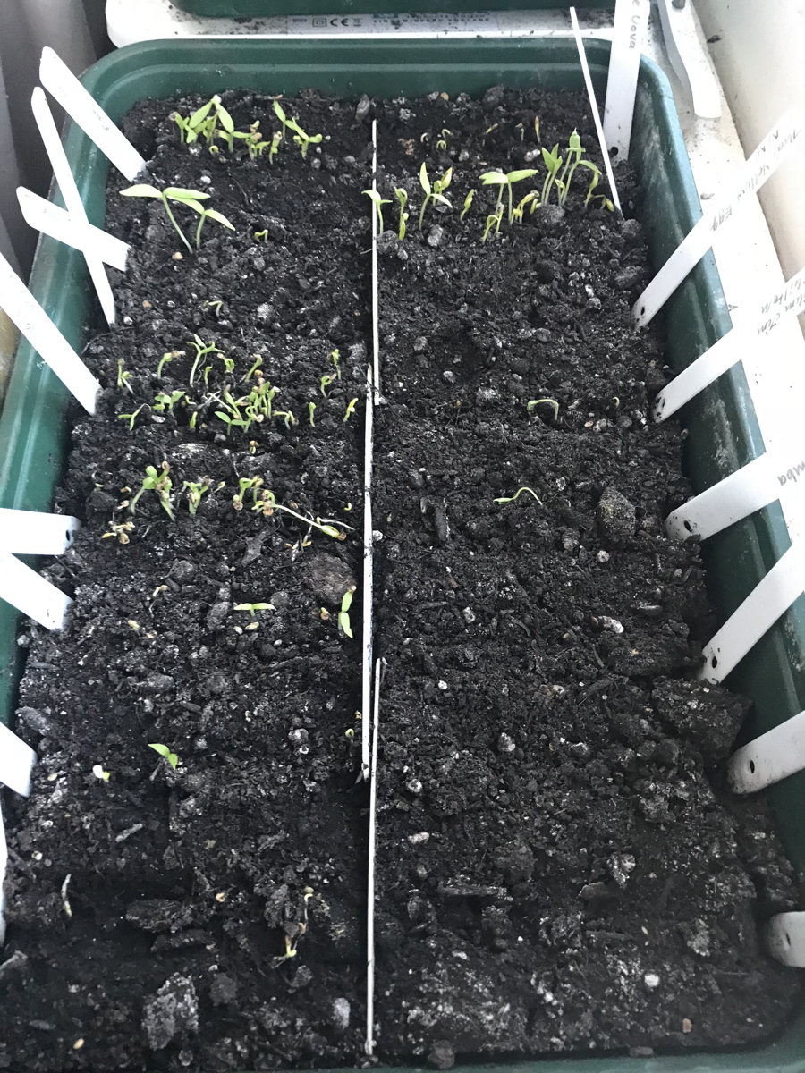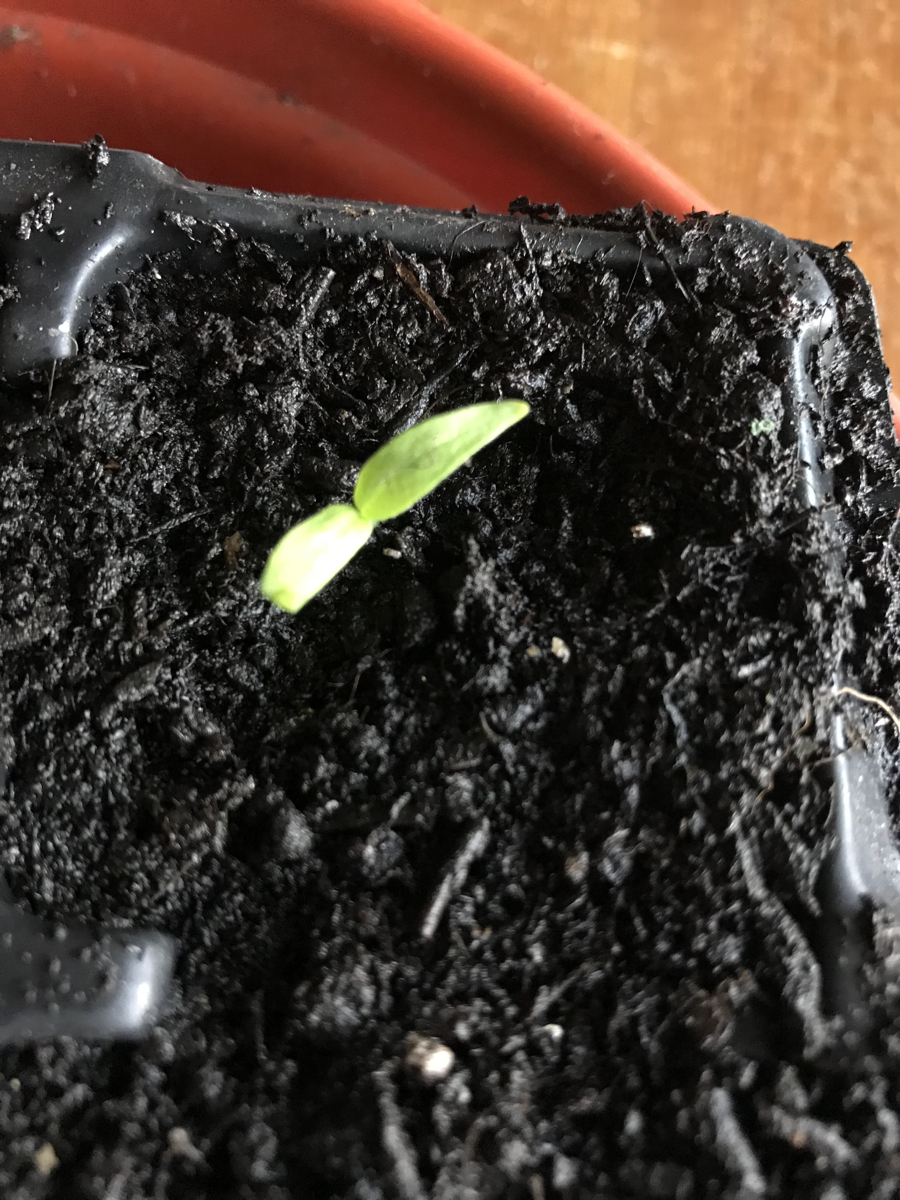 Two cotyledons and little sturdy stems. These are Mr Fothergill’s seeds that I am trying out this year – a variety bred to grow outdoors in the UK. It is far too early to know how they might grow, but they certainly germinate well.