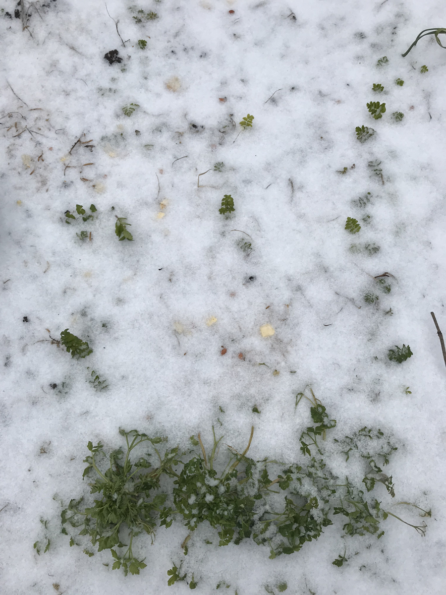 After two days under deep (for Somerset) snow, herbs started to emerge unscathed.