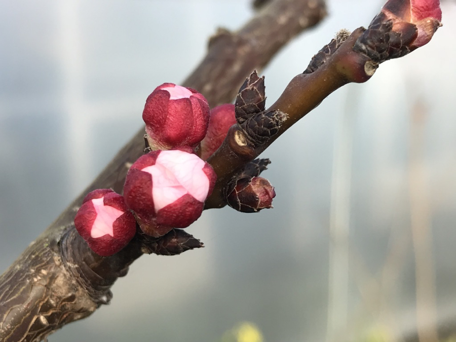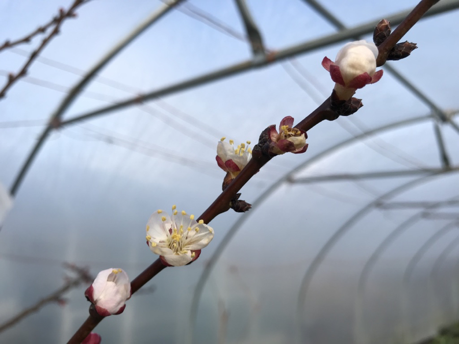 Outside I can see birds busy with beaks full of nesting material. After days under thick ice and snow, the frogs are busy falling in love again and spring has sprung in my polytunnel. The mystery potted fruit tree in the foreground is blossoming and the small dwarf apricot at the back, in bud. I’ll leave the polytunnel door open each day now, so insects can get in, but may also hand pollinate these blossoms.