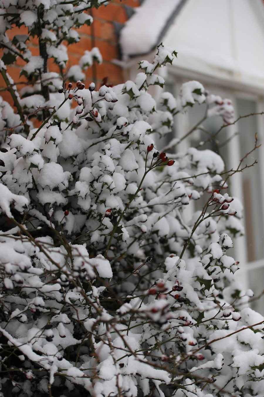 The pond, with its frog and frogspawn population, fortunately didn’t ice over completely – much to the delight of thirsty wild birds. The teasels, holly, dog roses and seedy wild plants in my front garden all provide a habitat and food for wild creatures – it looks untidy but to the wild birds, it is a valuable winter larder. I don’t think the finches got any seeds from those teasels today though!