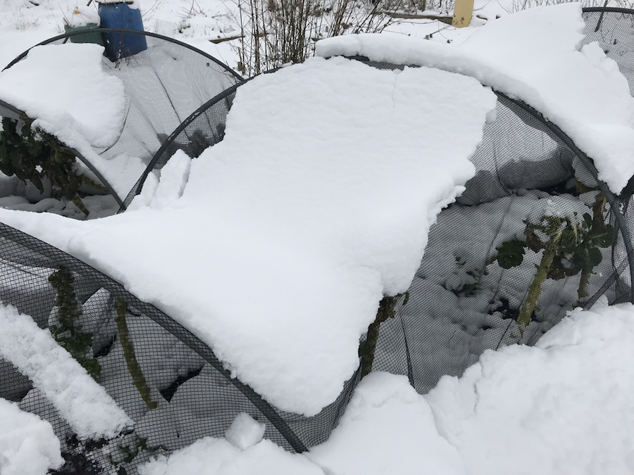 The perennial broccoli looked rather cosy in a mini-drift. I shook the snow from the winter brassicas to prevent damage to the plants. Still many more meals from these abundant veggies.