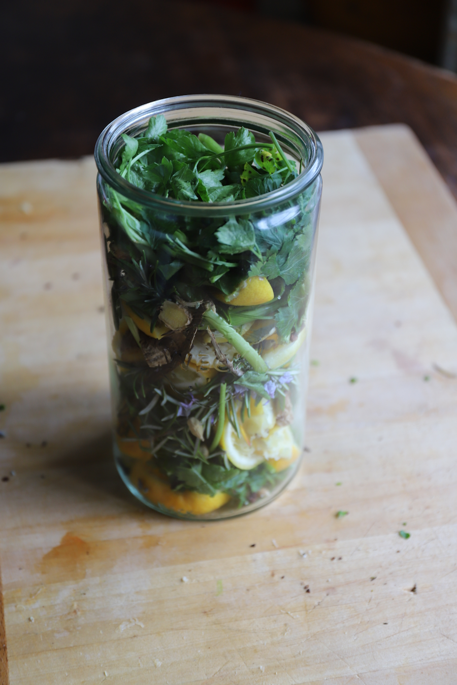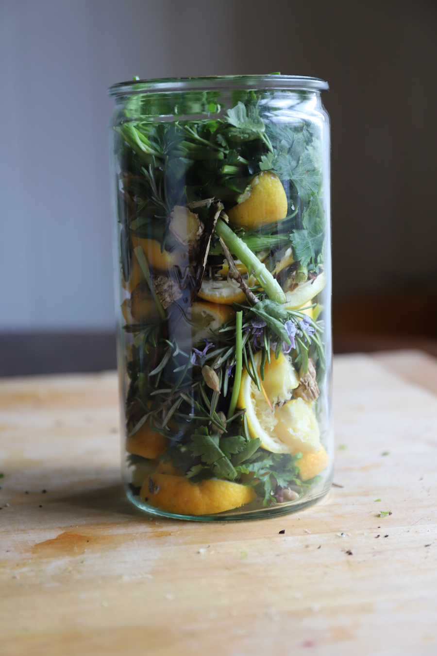 Place it on the surface of the peels and herbs, wiping up any spills if you have over filled your jar (like I did!)