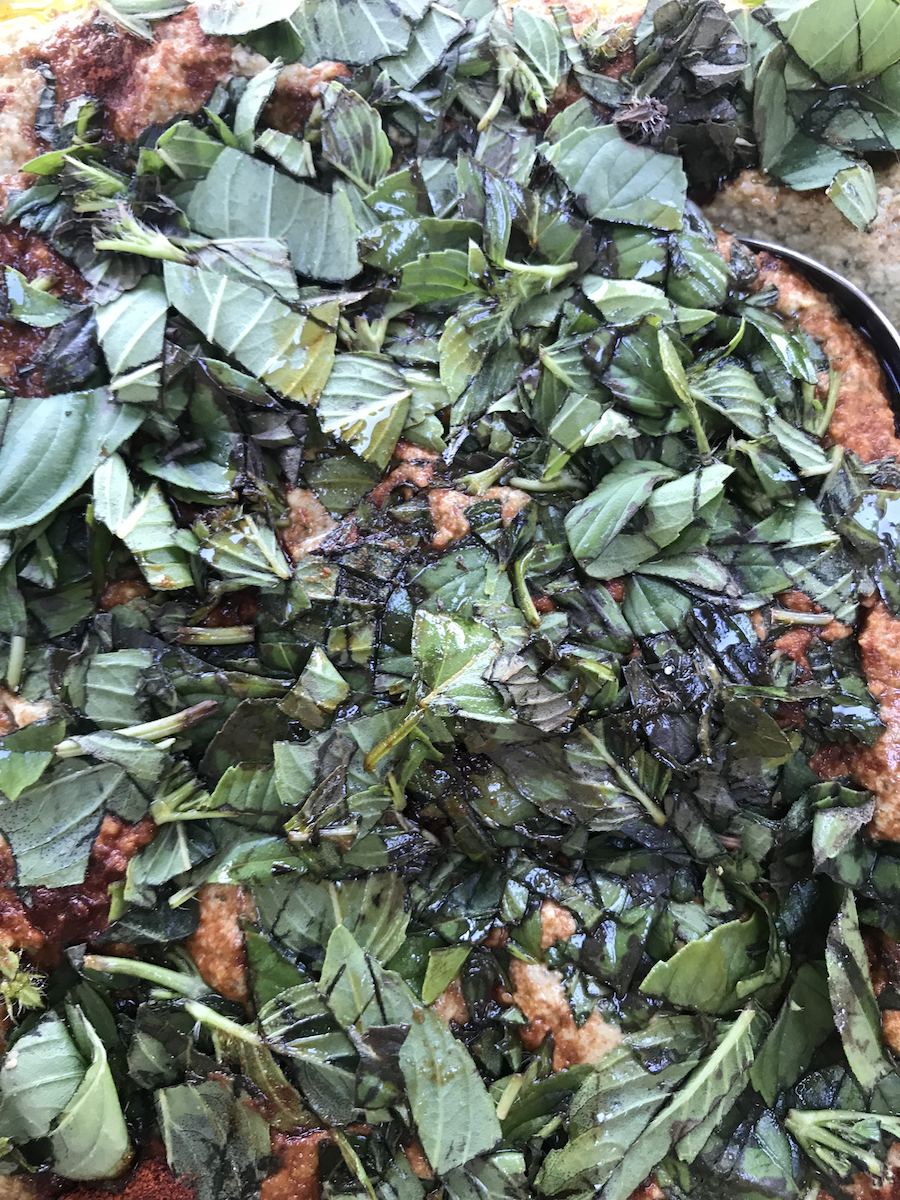 - lots of spicy basil on top of a borlotti bean, courgette and walnut pate