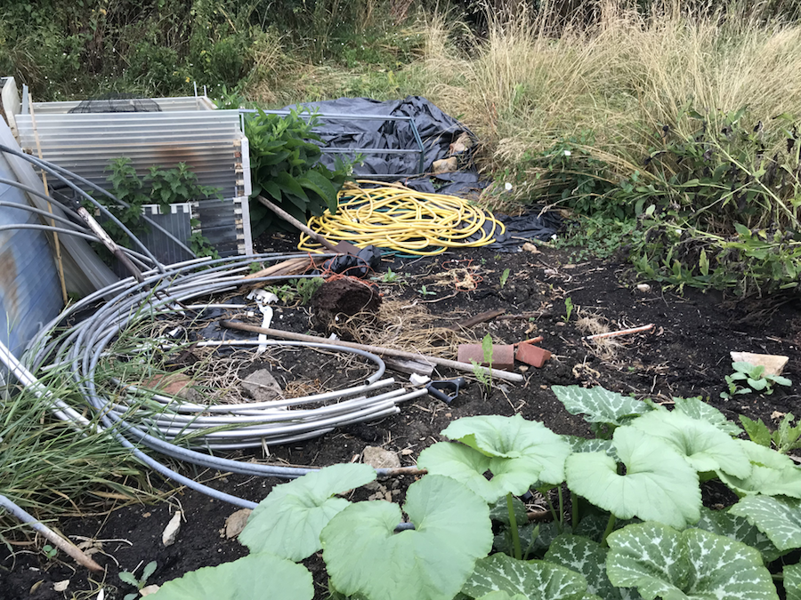 You may remember this area from earlier blog posts, where the fence was destroyed in high winds. I covered the area with polythene (the groundsheet of an old tent) after it had been trampled by the people repairing the fence with the timber from the damaged fencing temporarily…. and it is still there. No beds, but at least it isn’t weedy thanks to the polythene. It has become home to some odds and ends too, as can happen when a ‘temporary’ dumping ground is set up. I have had to decide to just let it go and not worry, this area will be sorted out at some point I’m sure and I have fortunately found another place to grow my winter brassicas and leeks.