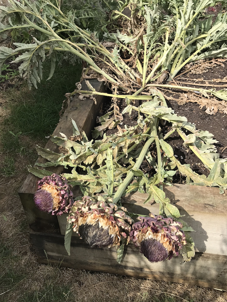 As if long dry hot days were not enough, we had a storm which flattened some sunflowers and these poor globe artichokes. I think they will regrow from the parent plant but the flowering stems are destined for the compost.